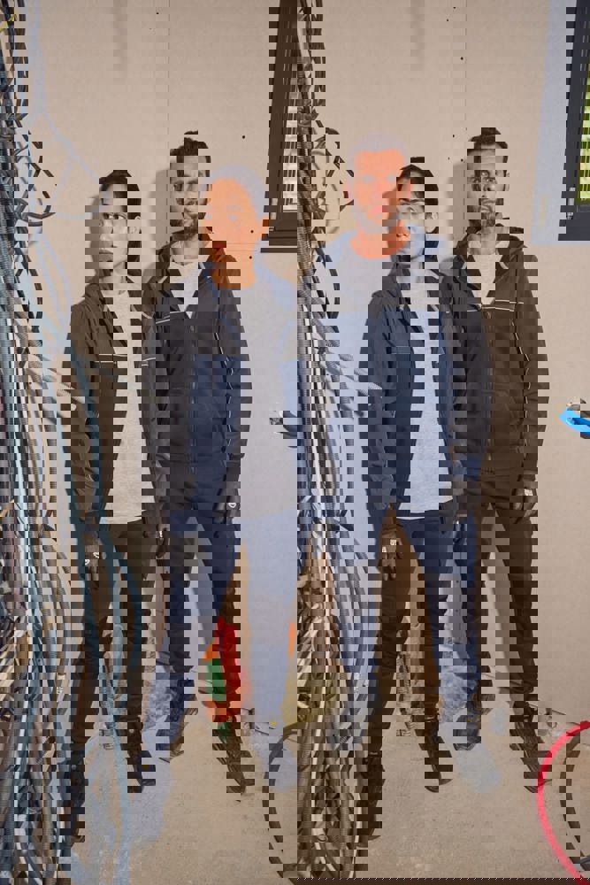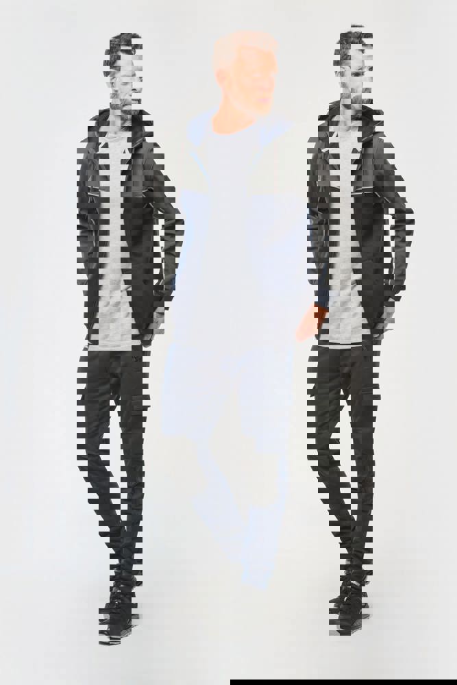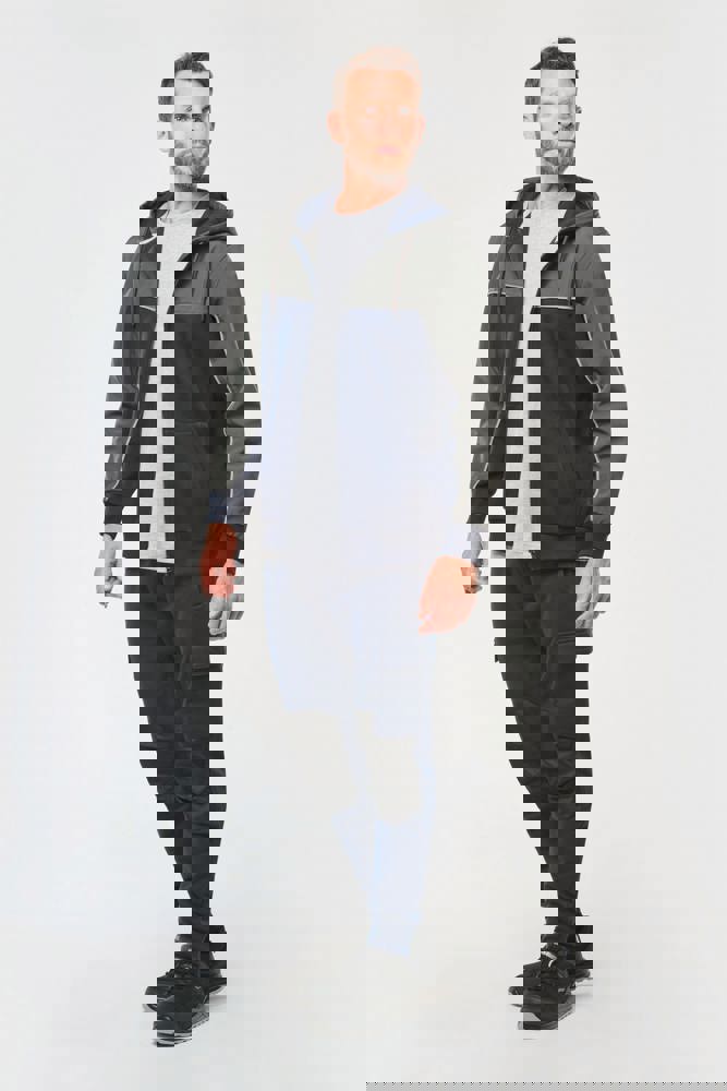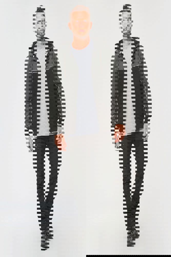 60 % Baumwolle / 40 % recycelter Polyester. Materialien für Einsätze: Softshell, 2 wasserabweisende Schichten 95 % Polyester / 5 % Elasthan. Gerader Schnitt. 2 Kängurutaschen. Zweiteilige Kapuze mit rundem Kordelzug mit Kappe aus Kautschuk. Kontrastfarbene Einsätze vorn, am Rücken und im oberen Ärmelbereich. Ton-in-Ton-Reißverschluss auf der Vorderseite. Halbmond hinten aus Softshell. Farblich abgesetzte Silber-Paspel auf Einsätzen vorn und an den Ärmeln. Aufhängeschlaufe und Nackenband im Fischgrätmuster (silber) im Kragen. Schlauchförmige 2x2 Ripp-Bündchen an Ärmelenden und unterem Saum. Abtrennbares Marken-Label.