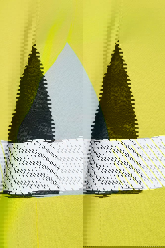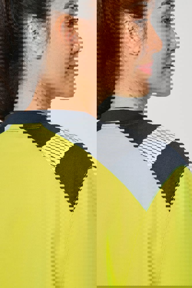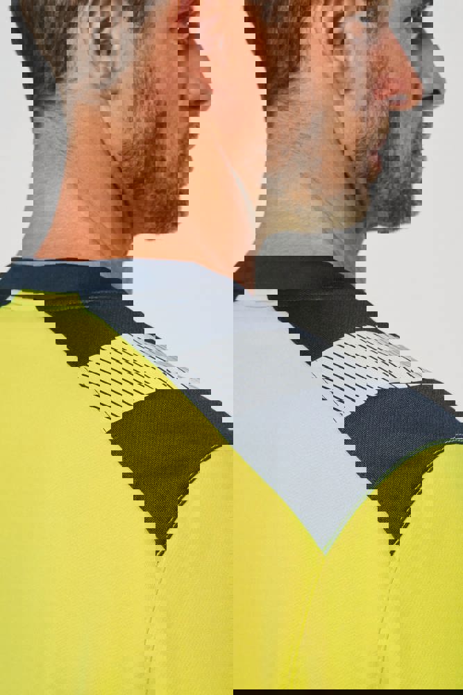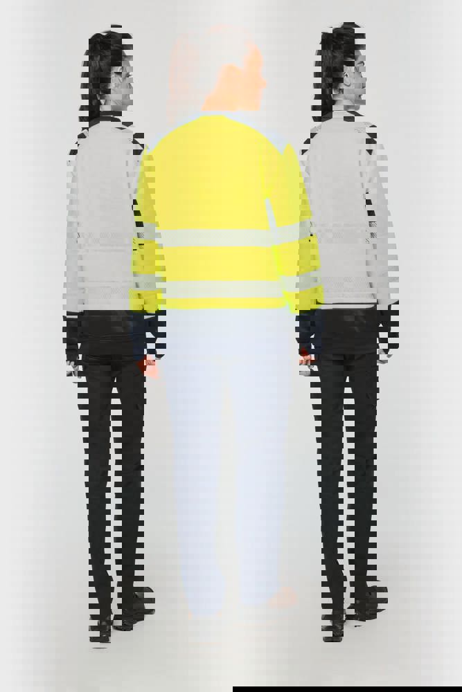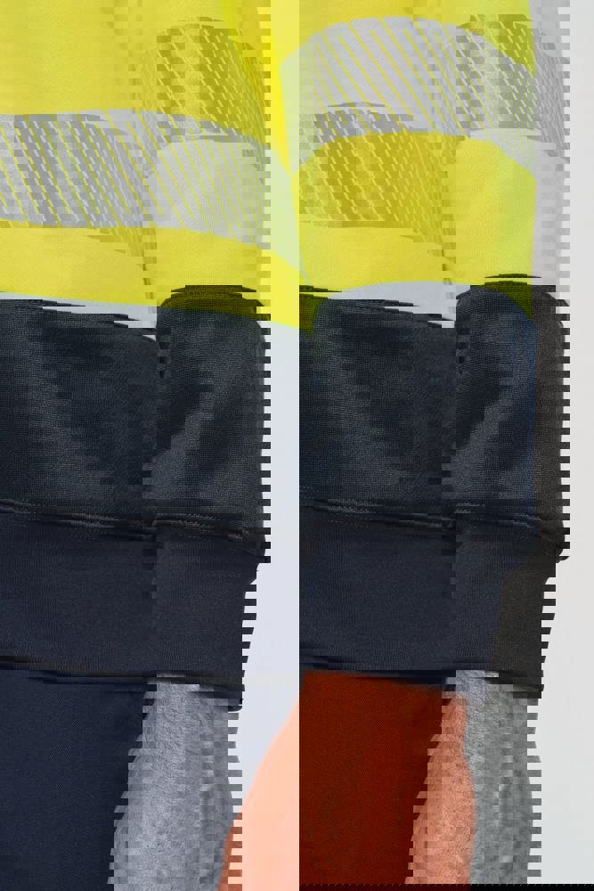 65 % recycelter Polyester / 35 % Baumwolle. Gekämmte Baumwolle. Gebürstetes Molton. Anti-Pilling-Behandlung. Waschen 60°C (25 Zyklen). Reguläre Passform. Kontrastfarbene Schultereinsätze mit 5 cm breitem, retroreflektierendem Segmentstreifen. Gefütterter Kragen aus 100% recyceltem Polyester in 1x1 Strickbündchen. Kontrastfarbener Unterarmeinsatz. 2 segmentierte, retroreflektierende Streifen von 5 cm vorne, hinten und an den Ärmeln. Kontrastfarbene Ärmel- und Saumabschlüsse. Kontrastfarbene 1x1-Strickbündchen aus 100% recyceltem Polyester an Ärmel- und Saumabschlüssen. EPI Klasse II. Normen NF EN 13758-1+A1:2007 + NF EN 13758-2+A1:2007: Schutz UPF40+ (Schutzeigenschaft gegen UV-Strahlung der Sonne), NF EN ISO 13688:2013 + NF EN ISO 13688/A1:2021 (Schutzkleidung - Allgemeine Anforderungen), NF EN ISO 20471:2013 + NF EN ISO 20471/A1:2017: Klasse 2 (Hochsichtbare Warnkleidung - Prüfverfahren und Anforderungen), RIS-3279-TOM Issue 2:2019 nur für die Farbe Hi Viz Orange/Navy (Standard für die Eisenbahnindustrie). Abtrennbares Marken-Label.