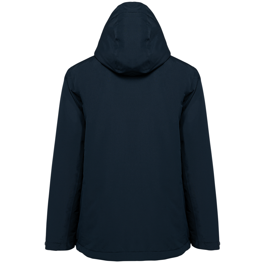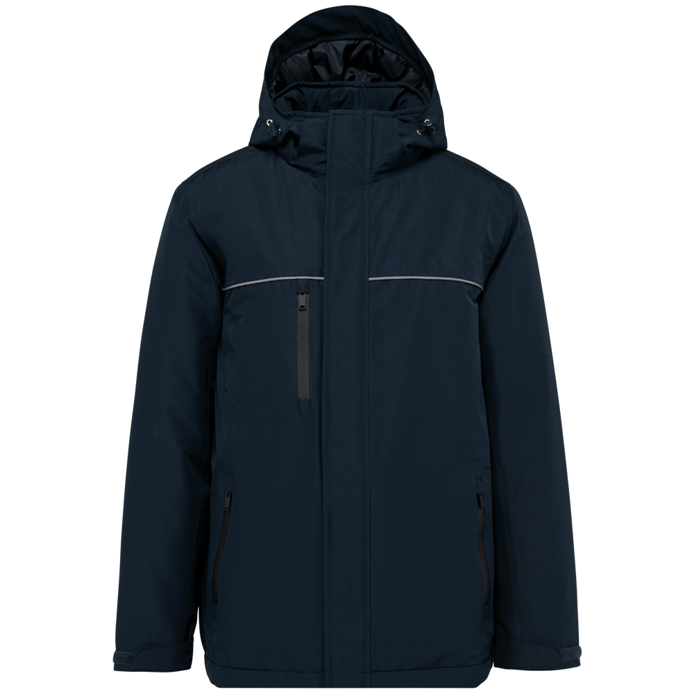 100 % Polyester. 2-lagiger Ripstop-Verbundstoff mit atmungsaktiver TPU-Membran 3000 g/m²/24 Std. Wasserabweisende Behandlung und wasserdicht verschweißte Nähte. Waschbar bei 40 °C. Oberer Körperbereich mit Fleece gefüttert. Unterer Körperbereich und Ärmel mit gestepptem Polyester 300T gefüttert. Wattierung: 100 % Polyester. Reißverschluss mit Kinnschutz, verborgen unter einer Windschutzleiste mit Klettverschlüssen. 2 Seitentaschen und 1 Brusttasche mit wasserdichten Reißverschlüssen. Kontrastpaspel auf Brusthöhe. Ärmelbündchen mit Klettverschlüssen verstellbar. Abnehmbare, gefütterte Kapuze mit elastischem Kordelzug und Stoppern. 1 Innentasche auf der rechten Brustseite mit Klettverschluss. 2 Reißverschlüsse zur Personalisierung innen: 1 auf Herzhöhe, 1 am unteren Rücken. Innere Aufhängeschlaufe am oberen Rücken. Saum mit elastischem Kordelzug und Stoppern verstellbar. PSA Kategorie I. Entspricht EN ISO 13688:2013+A1:2021 „Schutzkleidung – Allgemeine Anforderungen“ und EN 343:2019 „Schutzkleidung – Schutz gegen Regen“: Klasse 3 / Klasse 1 / X. Abtrennbares Markenetikett.