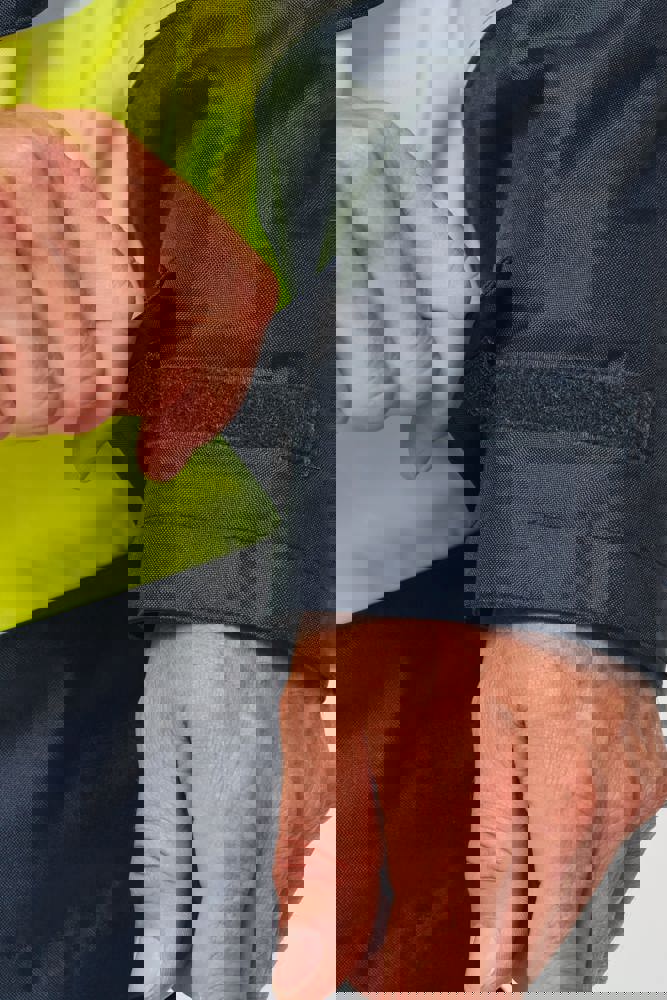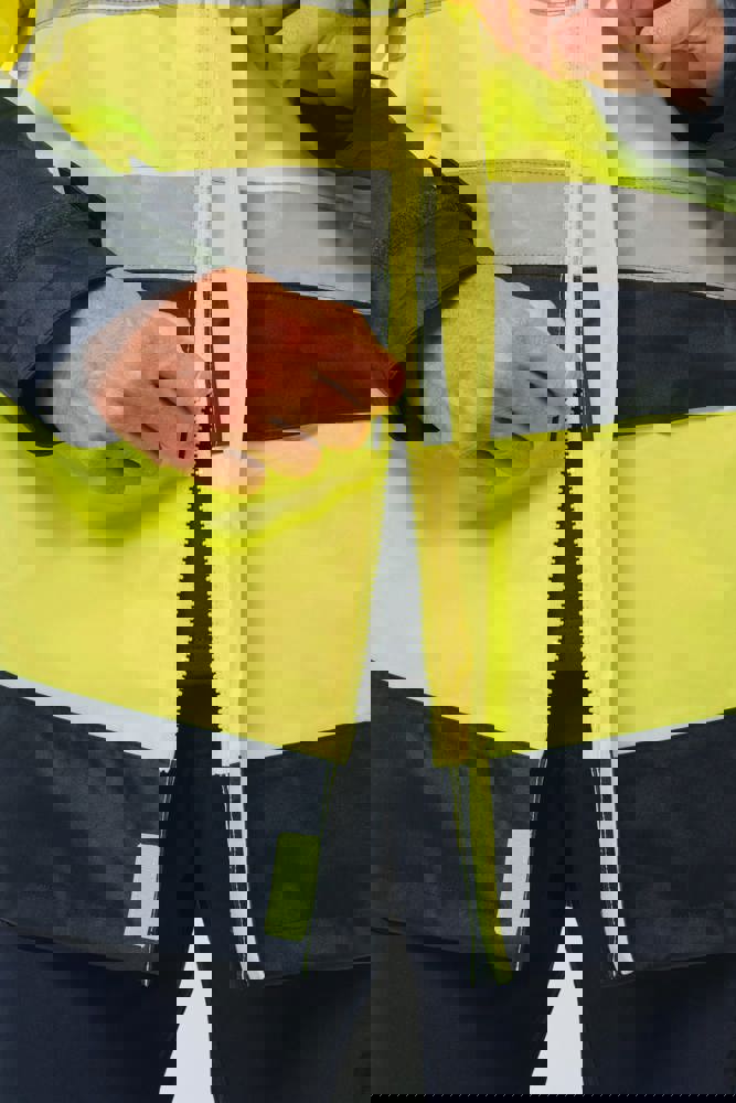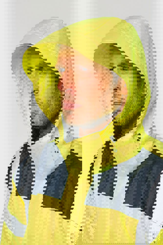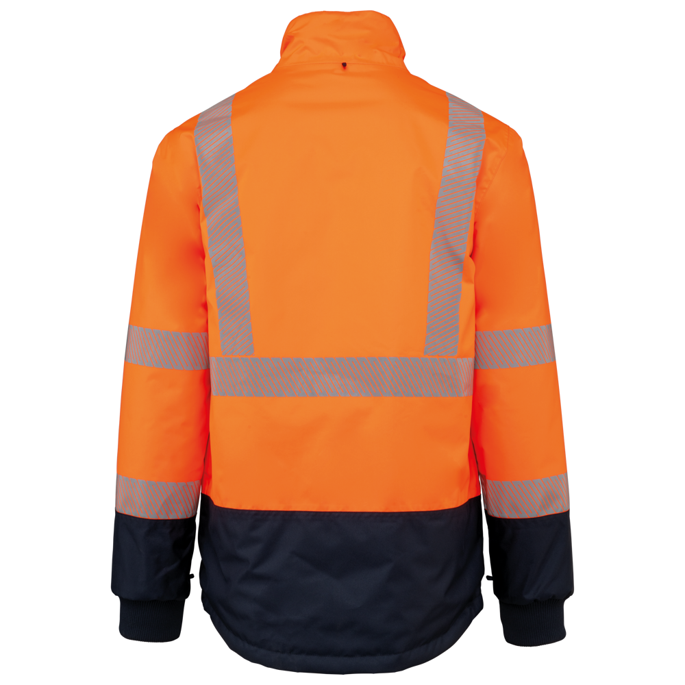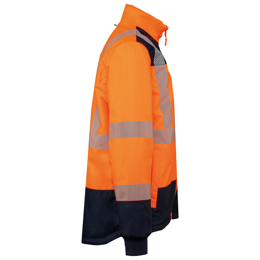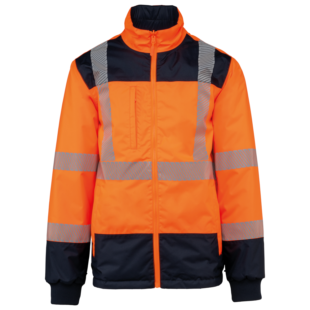 100 % recycelter Polyester. Oxford-Gewebe mit PU-Verstärkung. Wasserdichte Behandlung und wasserdichte, Wärmeversiegelte Nähte. Wäsche bei 40 °C. Zwei-Wege-Reißverschluss mit verdecktem Reißverschlusszug unter der mit Klettverschluss geschlossenen Leiste. Innenfutter für Körper und Ärmel aus 100% Polyester-Mesh. 2 vertikale Seitentaschen mit Reißverschluss + 2 horizontale Taschen mit Patten, die mit Klettverschluss geschlossen werden. 1 verdeckte Brusttasche mit Reißverschluss unter der Leiste auf der linken Seite beim Tragen. Ärmel mit Klettverschluss verstellbar. Kontrastfarbene Innenseite des Kragens aus 100% Polyester-Fleece mit Befestigungshaken. Abnehmbare Kapuze mit Reißverschluss, die mit Mesh gefüttert ist und mit elastischen Kordeln und Klettverschlüssen verstellt werden kann. Die Kapuzentasche ist im Kragen versteckt und mit Klettverschlüssen versehen. Kontrasteinsätze an Schultern, Ärmelenden, Saum und Taschenklappen. 5 cm breite retroreflektierende Segmentstreifen auf Schultern, Brust, Körper und Ärmeln, Vorder- und Rückseite. 1 Reißverschluss an der Brust + 1 aufgesetzte Tasche, die beim Tragen mit einem Klettverschluss an der linken Innenseite verschlossen wird. 1 innenliegender Reißverschluss zur Veredelung am Saum des Kleidungsstücks. Saum mit elastischen Kordeln verstellbar. Beidseitig tragbare Innenjacke: 100 % recycelter Polyester. Oxford-Gewebe mit PU-Verstärkung. Wasserdichte Behandlung und wasserdichte, Wärmeversiegelte Nähte. Waschen 40°C (25 Zyklen). Reißverschluss mit wendbarem Schieber und Reißverschlussanhänger. 2 vertikale Seitentaschen mit Reißverschluss. 1 Brusttasche mit Reißverschluss auf der rechten Seite beim Tragen. Strickbündchen an 2x2 Ärmelabschlüssen. Kontrastfarbene Einsätze am Oberkörper vorne, an den Ärmelenden und am Saum, vorne und hinten. 5 cm breite segmentierte retroreflektierende Streifen auf Körper und Ärmeln, Vorder- und Rückseite. Beidseitig tragbare Seite: 100 % Polyamid. Taftstoff mit PA-Verstärkung und Polsterung. 2 vertikale Seitentaschen mit Reißverschluss. Befestigungshaken auf der Krageninnenseite. 1 unsichtbarer Reißverschluss zur Veredelung am unteren Saum, der in einer Naht verborgen ist. Die Kleidungsstücke werden durch ein Reißverschlusssystem in der vorderen Mitte sowie durch Knöpfe mit Befestigungshaken im Kragen und an den Ärmeln miteinander verbunden. EPI Klasse II. Normen NF EN ISO 13688:2013 + NF EN ISO 13688/A1:2021 (Schutzkleidung - Allgemeine Anforderungen), NF EN ISO 20471:2013 + NF EN ISO 20471/A1:2017: Outdoor-Parka - Klasse 3, Innenjacke - Klasse 2 (Hochsichtbare Kleidung - Prüfverfahren und Anforderungen), NF EN 343:2019: Klasse 3: 3 nur für den Outdoor-Parka (Schutzkleidung - Regenschutz), RIS-3279-TOM Issue 2:2019 nur für die Farbe Hi Viz Orange/Navy (Standard für die Eisenbahnindustrie). Abtrennbares Marken-Label.