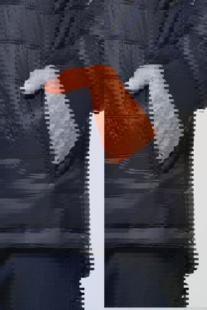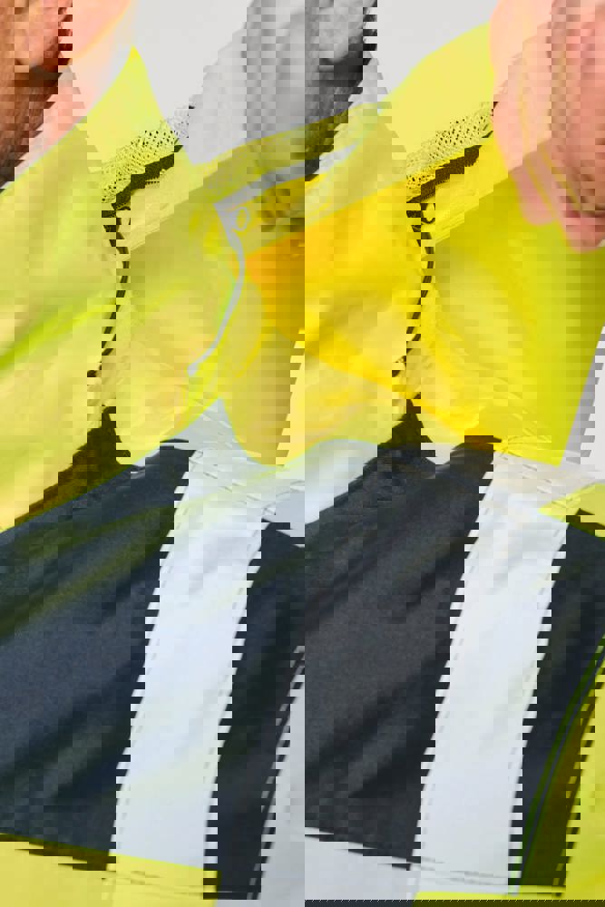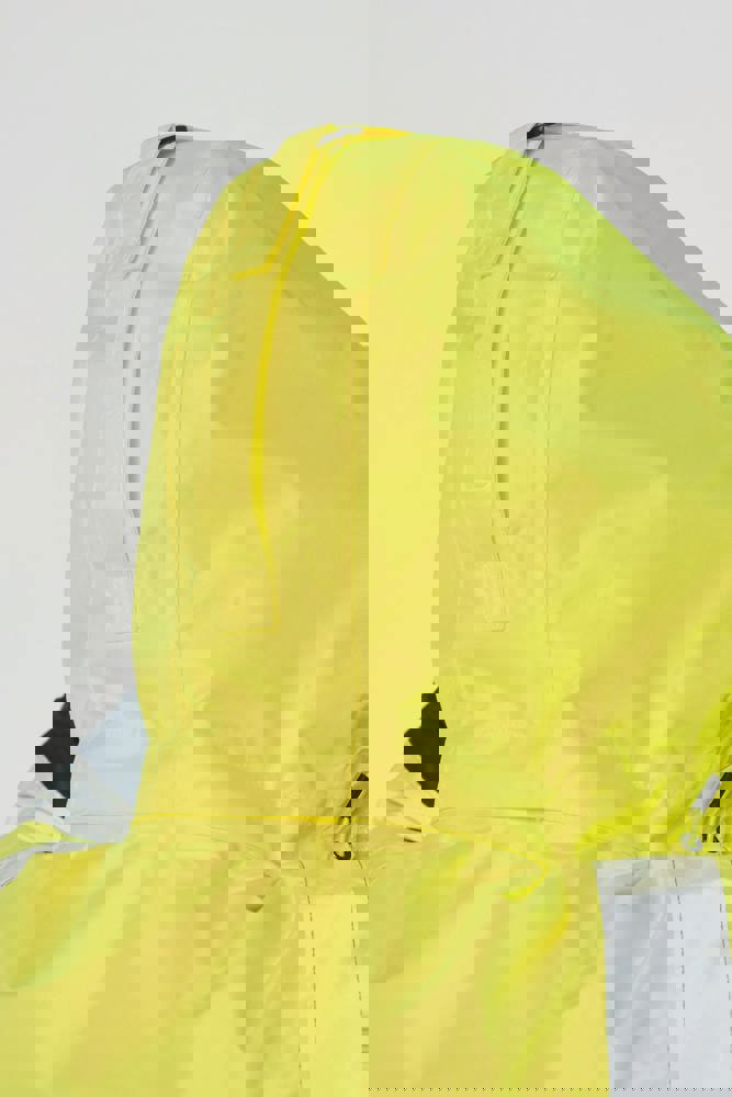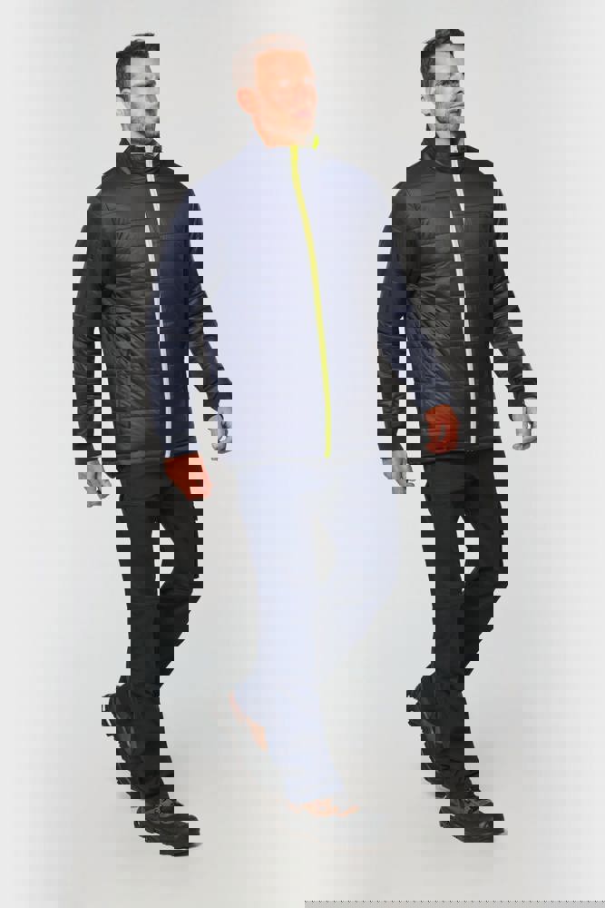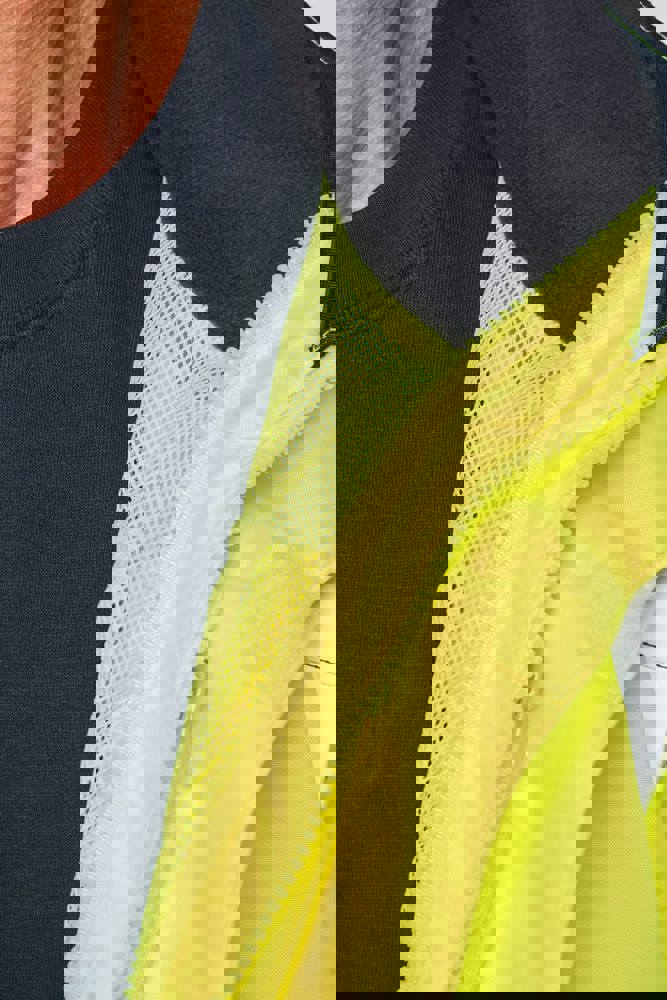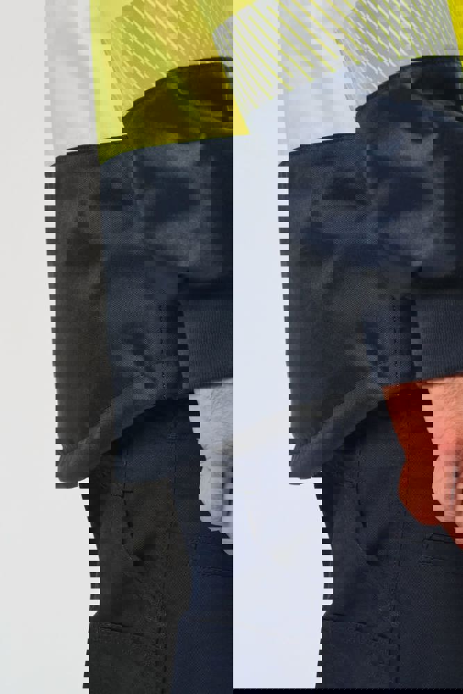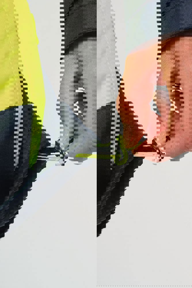 100 % recycelter Polyester. Oxford-Gewebe mit PU-Verstärkung. Wasserdichte Behandlung und wasserdichte, Wärmeversiegelte Nähte. Wäsche bei 40 °C. Zwei-Wege-Reißverschluss mit verdecktem Reißverschlusszug unter der mit Klettverschluss geschlossenen Leiste. Innenfutter für Körper und Ärmel aus 100% Polyester-Mesh. 2 vertikale Seitentaschen mit Reißverschluss + 2 horizontale Taschen mit Patten, die mit Klettverschluss geschlossen werden. 1 verdeckte Brusttasche mit Reißverschluss unter der Leiste auf der linken Seite beim Tragen. Ärmel mit Klettverschluss verstellbar. Kontrastfarbene Innenseite des Kragens aus 100% Polyester-Fleece mit Befestigungshaken. Abnehmbare Kapuze mit Reißverschluss, die mit Mesh gefüttert ist und mit elastischen Kordeln und Klettverschlüssen verstellt werden kann. Die Kapuzentasche ist im Kragen versteckt und mit Klettverschlüssen versehen. Kontrasteinsätze an Schultern, Ärmelenden, Saum und Taschenklappen. 5 cm breite retroreflektierende Segmentstreifen auf Schultern, Brust, Körper und Ärmeln, Vorder- und Rückseite. 1 Reißverschluss an der Brust + 1 aufgesetzte Tasche, die beim Tragen mit einem Klettverschluss an der linken Innenseite verschlossen wird. 1 innenliegender Reißverschluss zur Veredelung am Saum des Kleidungsstücks. Saum mit elastischen Kordeln verstellbar. Beidseitig tragbare Innenjacke: 100 % recycelter Polyester. Oxford-Gewebe mit PU-Verstärkung. Wasserdichte Behandlung und wasserdichte, Wärmeversiegelte Nähte. Waschen 40°C (25 Zyklen). Reißverschluss mit wendbarem Schieber und Reißverschlussanhänger. 2 vertikale Seitentaschen mit Reißverschluss. 1 Brusttasche mit Reißverschluss auf der rechten Seite beim Tragen. Strickbündchen an 2x2 Ärmelabschlüssen. Kontrastfarbene Einsätze am Oberkörper vorne, an den Ärmelenden und am Saum, vorne und hinten. 5 cm breite segmentierte retroreflektierende Streifen auf Körper und Ärmeln, Vorder- und Rückseite. Beidseitig tragbare Seite: 100 % Polyamid. Taftstoff mit PA-Verstärkung und Polsterung. 2 vertikale Seitentaschen mit Reißverschluss. Befestigungshaken auf der Krageninnenseite. 1 unsichtbarer Reißverschluss zur Veredelung am unteren Saum, der in einer Naht verborgen ist. Die Kleidungsstücke werden durch ein Reißverschlusssystem in der vorderen Mitte sowie durch Knöpfe mit Befestigungshaken im Kragen und an den Ärmeln miteinander verbunden. EPI Klasse II. Normen NF EN ISO 13688:2013 + NF EN ISO 13688/A1:2021 (Schutzkleidung - Allgemeine Anforderungen), NF EN ISO 20471:2013 + NF EN ISO 20471/A1:2017: Outdoor-Parka - Klasse 3, Innenjacke - Klasse 2 (Hochsichtbare Kleidung - Prüfverfahren und Anforderungen), NF EN 343:2019: Klasse 3: 3 nur für den Outdoor-Parka (Schutzkleidung - Regenschutz), RIS-3279-TOM Issue 2:2019 nur für die Farbe Hi Viz Orange/Navy (Standard für die Eisenbahnindustrie). Abtrennbares Marken-Label.