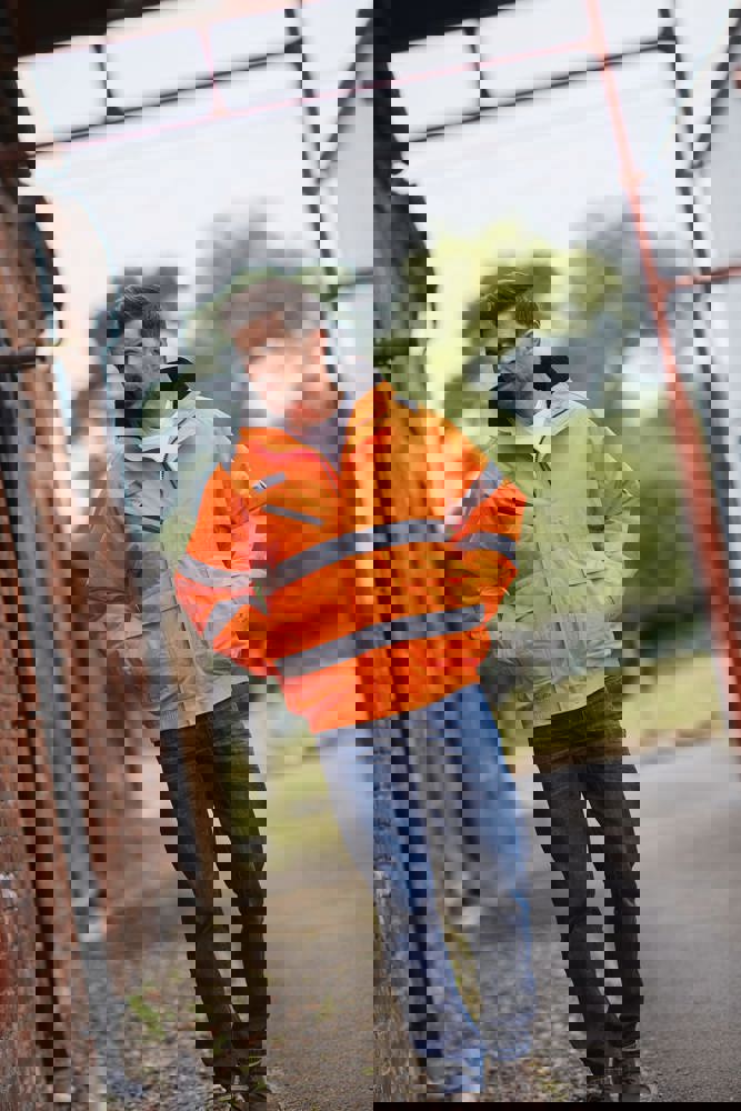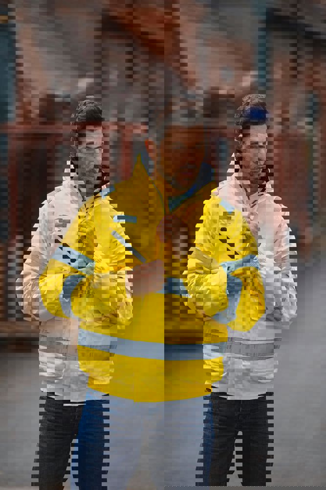 Polyester-Jacke aus Ripstop-Material mit feinem Karomuster, wasserbeständig und atmungsaktiv. Abnehmbares Sherpa-Fleecefutter. Reflektierende 5-cm-Bänder an Rumpf und Armen. Zwei reflektierende Bänder auf den Schultern. Brusttasche mit wasserbeständigem Reißverschluss. Stifttasche und Handytasche auf dem linken Arm. Abnehmbare Kapuze. Zweiwege-Reißverschluss. Entspricht der Norm EN ISO20471, Kategorie 3.