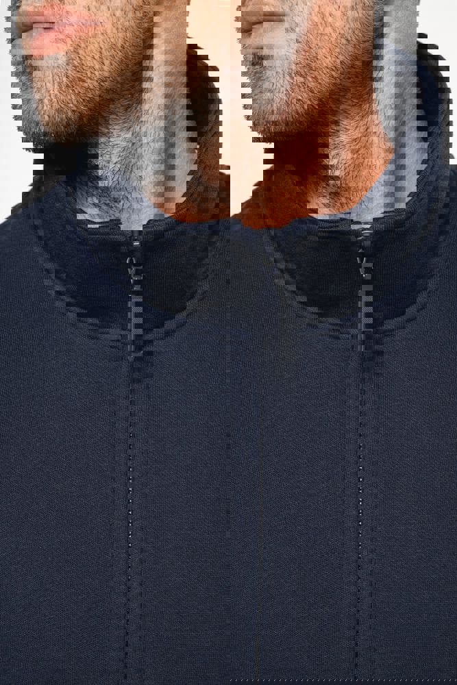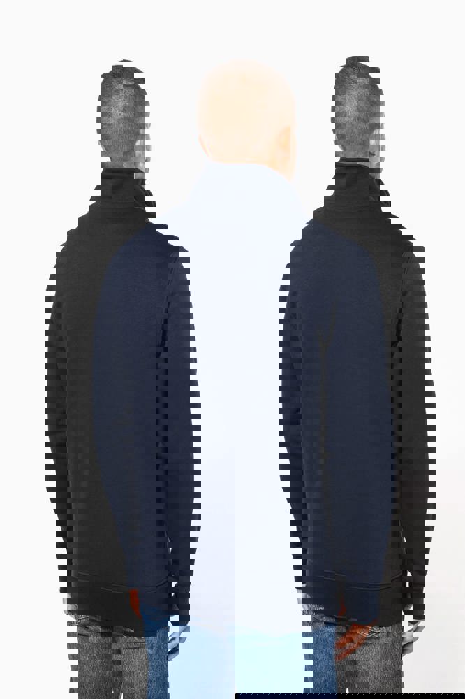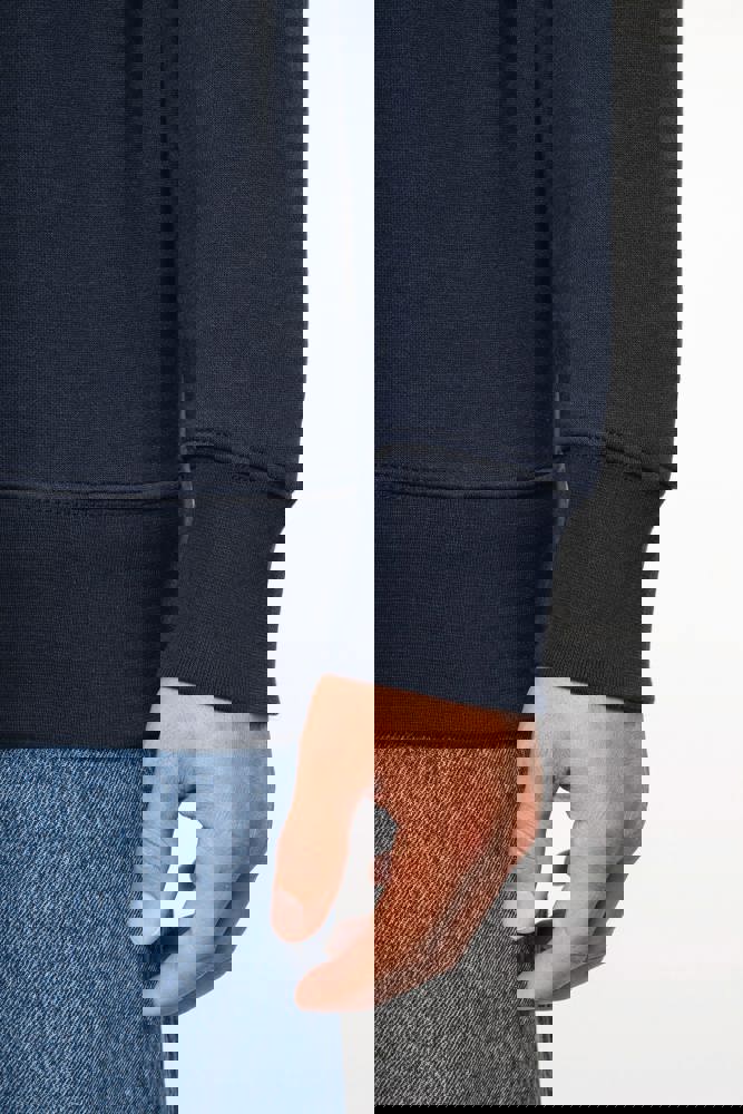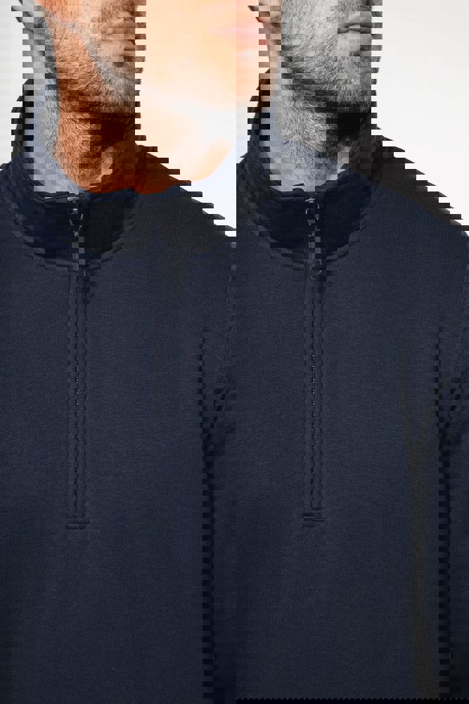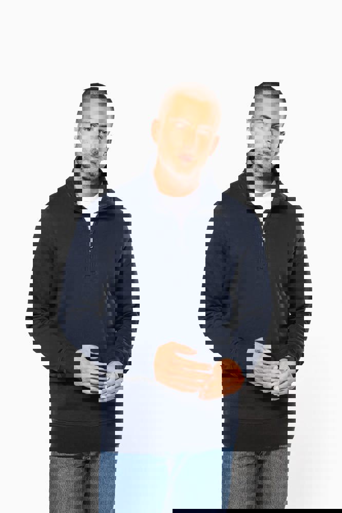 80 % Baumwolle / 20 % Polyester (Ash Heather : 79% Baumwolle / 20% Polyester / 1% Viskose). Außenseiteaus 100% Baumwolle. LSF-Behandlung (Low Shrinkage Fleece: vorgeschrumpftes Fleece). Gebürstetes Fleece mit drei Fäden aus gekämmter Baumwolle. Set-in-Ärmel. Kragen mit farblich abgestimmtem Kunststoff-Reißverschluss. Nackenband in Kontrastfarbe am Kragen (Heather Grey für alle Farben, Navy für Oxford-Grey und Ash Heather). Strickbündchen an Ärmeln und Saum.