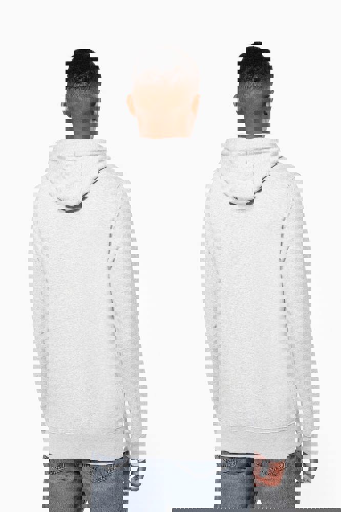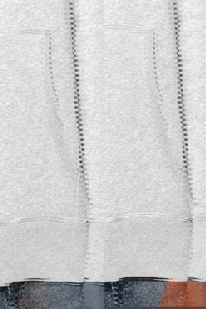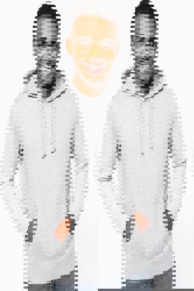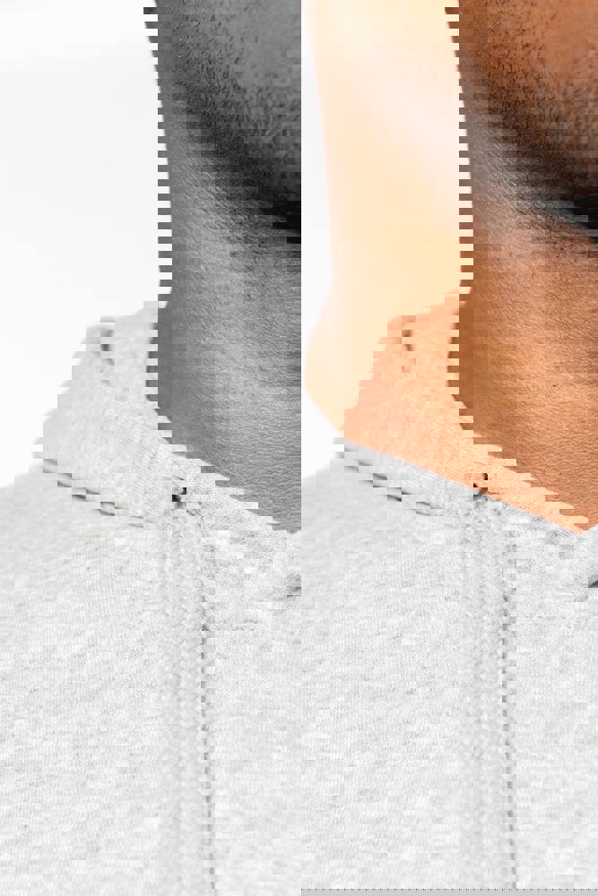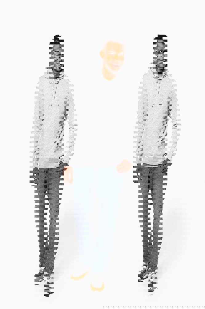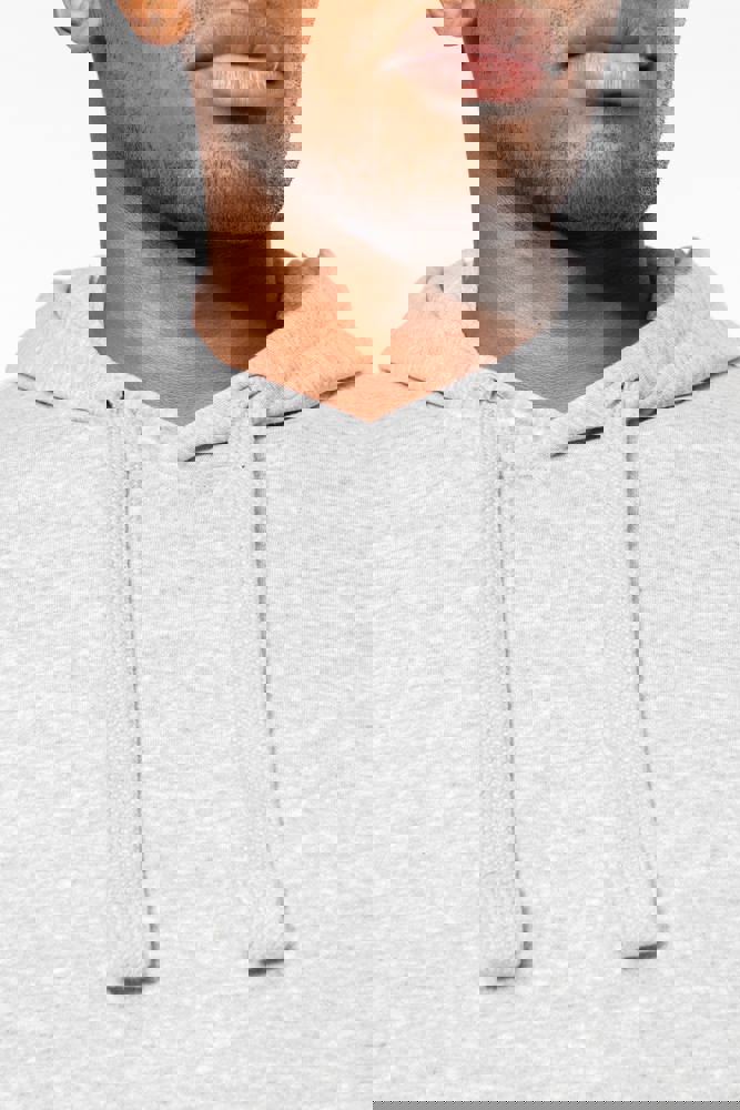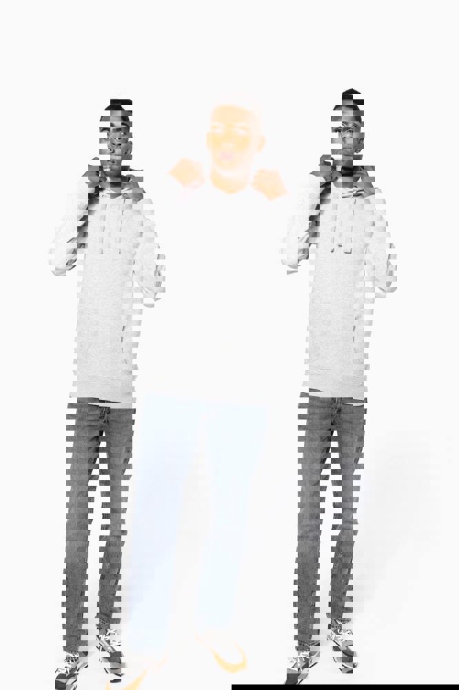 80 % Baumwolle / 20 % Polyester (Ash Heather : 79% Baumwolle / 20% Polyester / 1% Viskose). Außenseiteaus 100% Baumwolle. LSF-Behandlung (Low Shrinkage Fleece: vorgeschrumpftes Fleece). Gebürstetes Fleece mit drei Fäden aus gekämmter Baumwolle. Set-in-Ärmel. Nackenband in Kontrastfarbe am Kragen (Navy für Oxford-Grey und Ash Heather, Heather Grey für alle anderen Farben). Gefütterte Kapuze mit Wabenstruktur und Kordelzug. Kängurutaschen. Strickbündchen an Ärmeln und Saum.