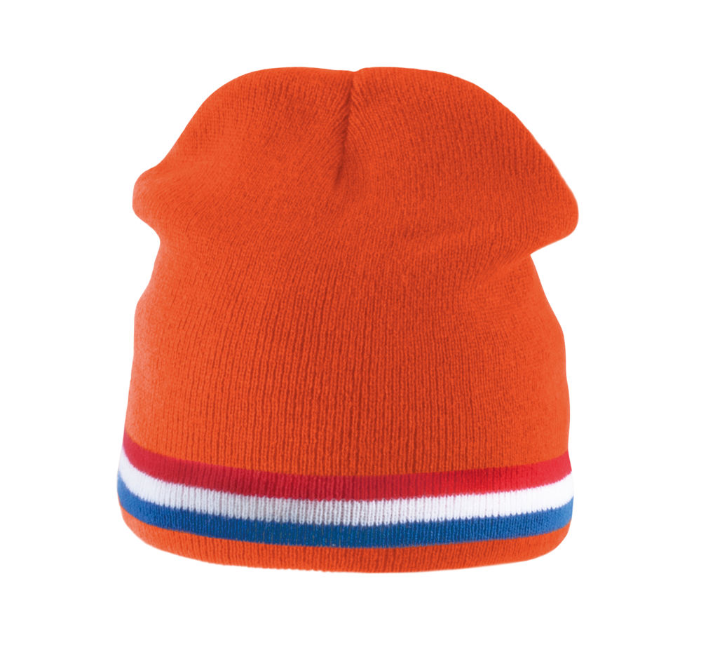 100% Acryl. Strickmütze mit Kontraststreifen am Rand.