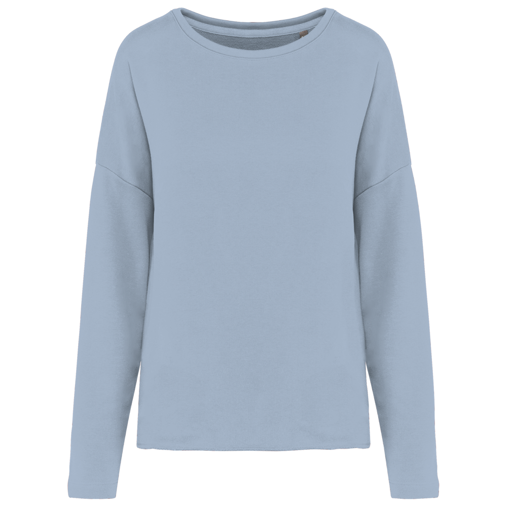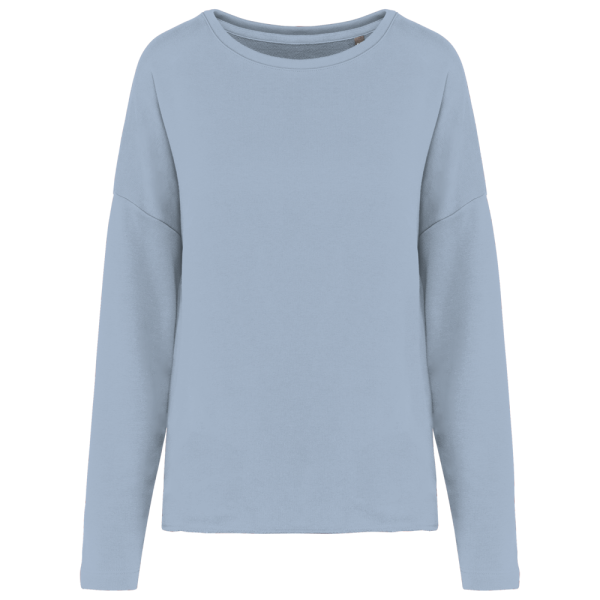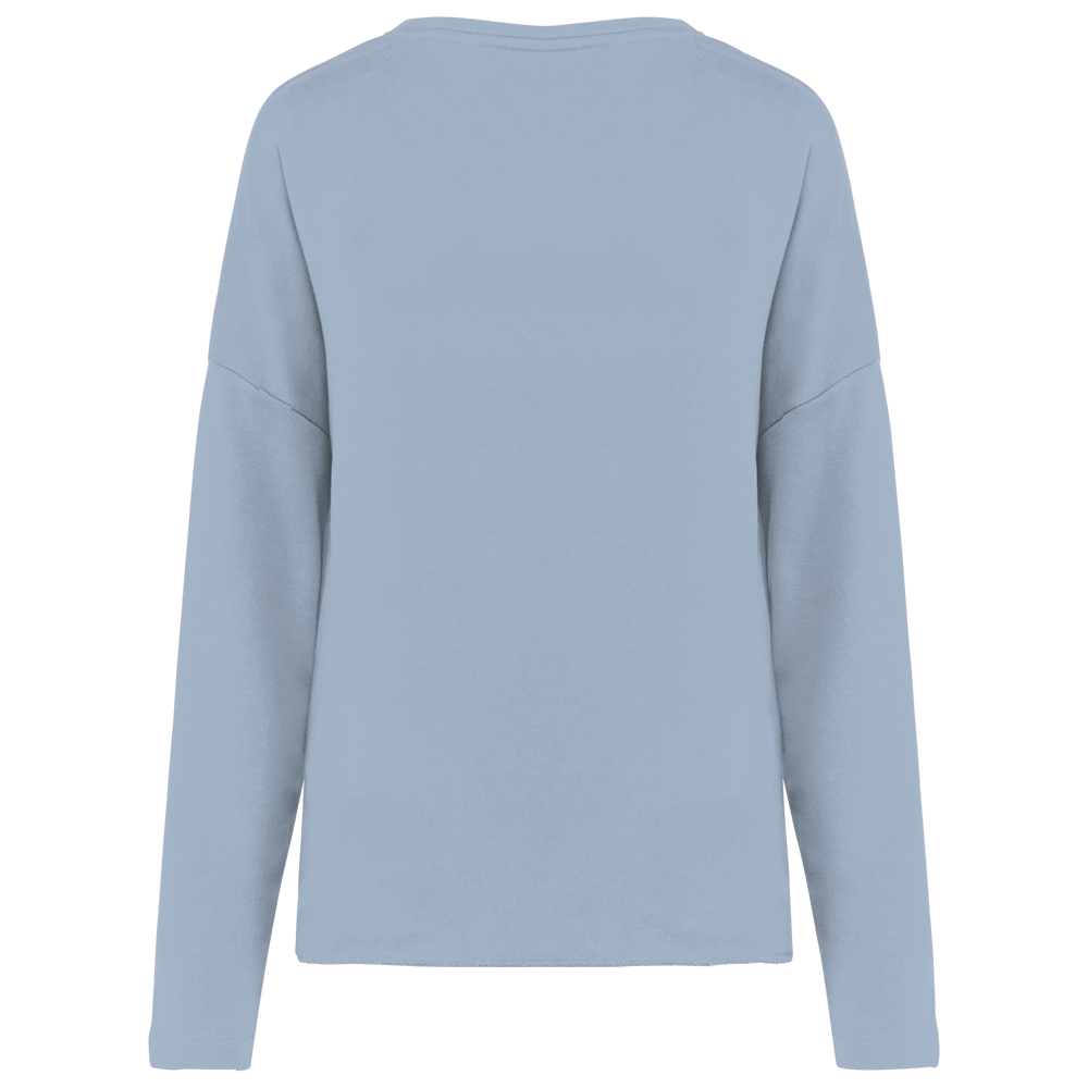 91 % Baumwolle / 9 % Polyester (Light Grey Heather: 87 % Baumwolle / 9 % Polyester / 4 % Viskose). Ungebürstetes Fleece „French Terry". Sehr weiche Textur. Lockere Passform mit großem Halsausschnitt. Fischgrätnackenband. Ungesäumter Abschluss unten. Doppelnähte am Ärmelbündchen.