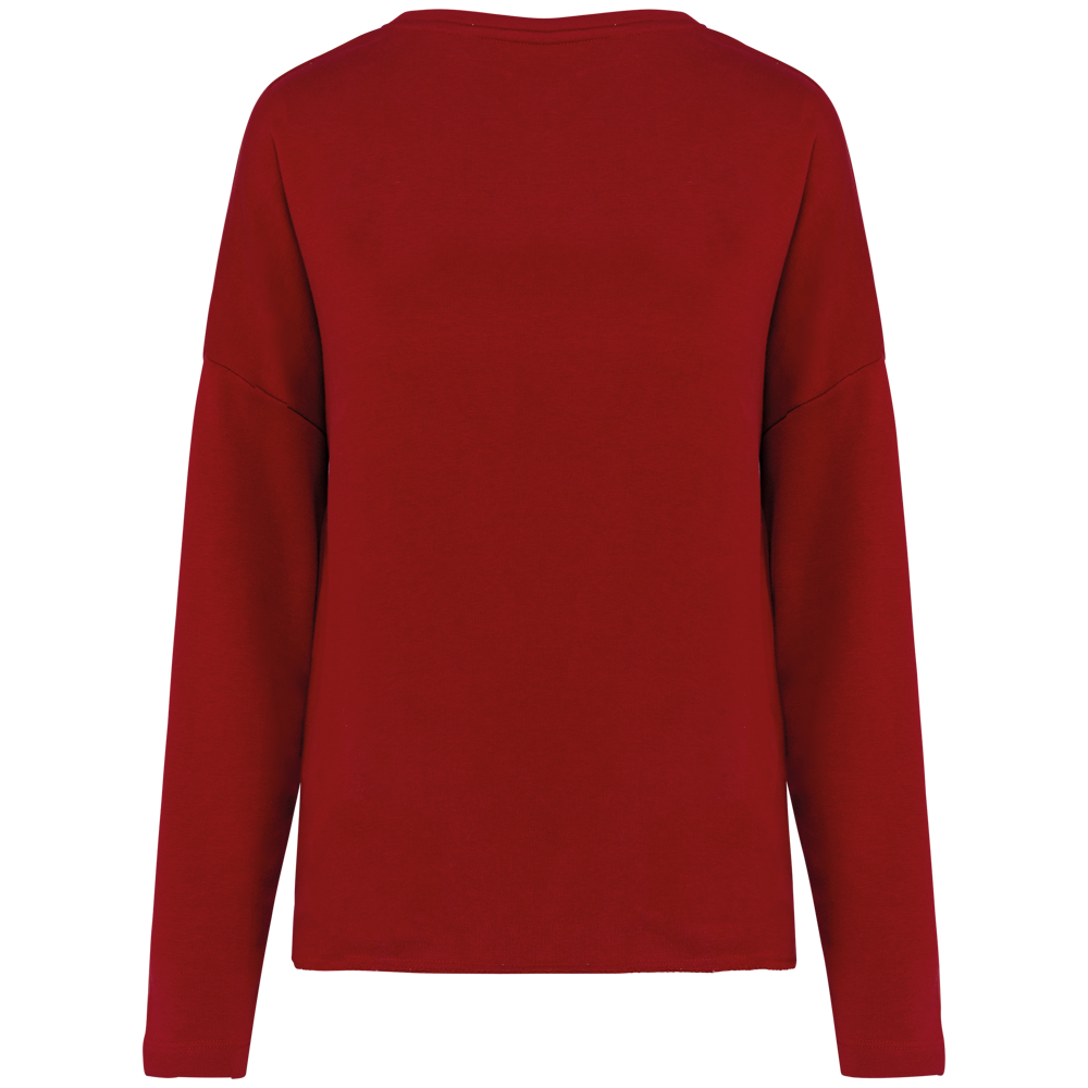91 % Baumwolle / 9 % Polyester (Light Grey Heather: 87 % Baumwolle / 9 % Polyester / 4 % Viskose). Ungebürstetes Fleece „French Terry". Sehr weiche Textur. Lockere Passform mit großem Halsausschnitt. Fischgrätnackenband. Ungesäumter Abschluss unten. Doppelnähte am Ärmelbündchen.