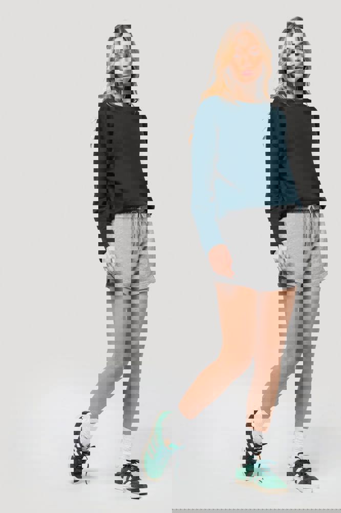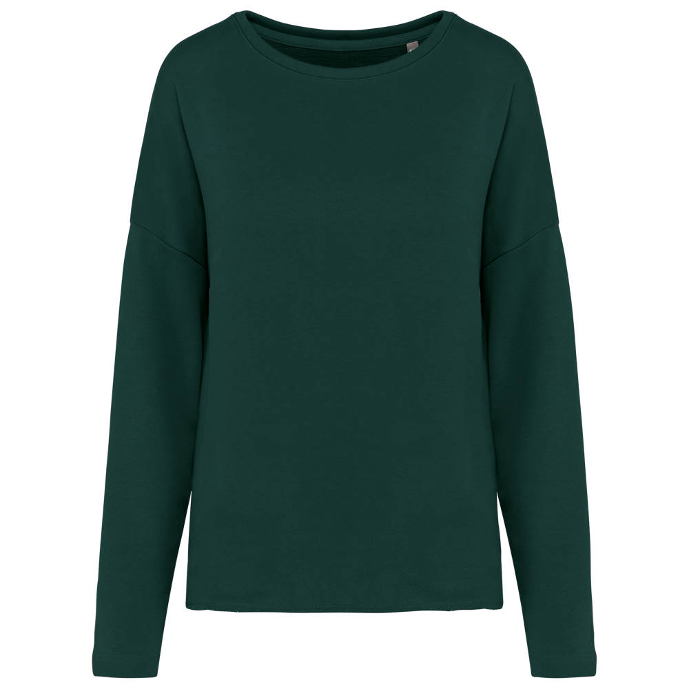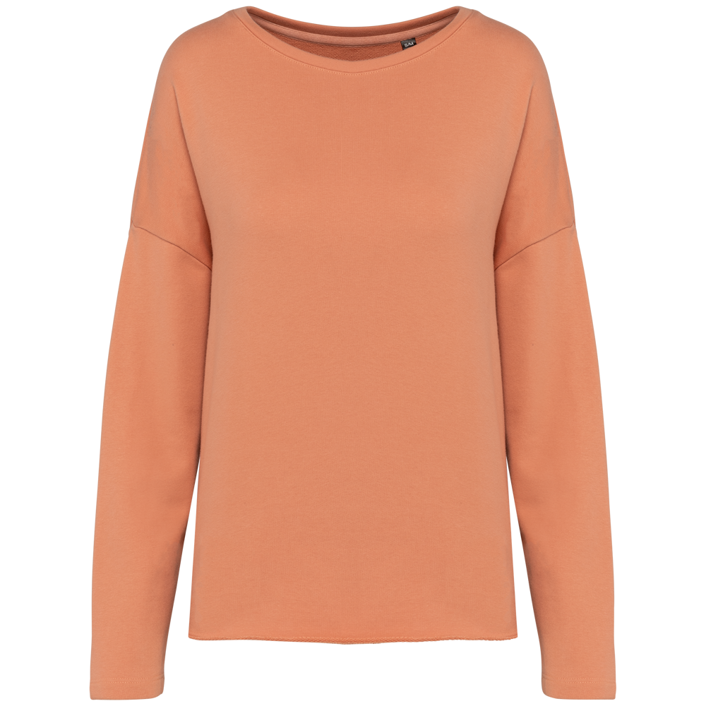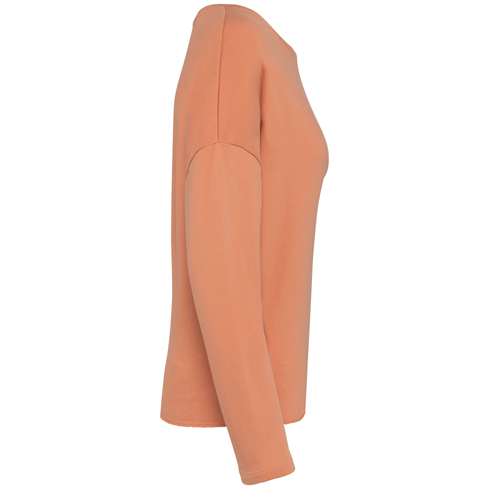 91 % Baumwolle / 9 % Polyester (Light Grey Heather: 87 % Baumwolle / 9 % Polyester / 4 % Viskose). Ungebürstetes Fleece „French Terry". Sehr weiche Textur. Lockere Passform mit großem Halsausschnitt. Fischgrätnackenband. Ungesäumter Abschluss unten. Doppelnähte am Ärmelbündchen.