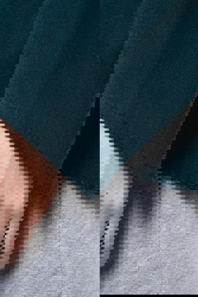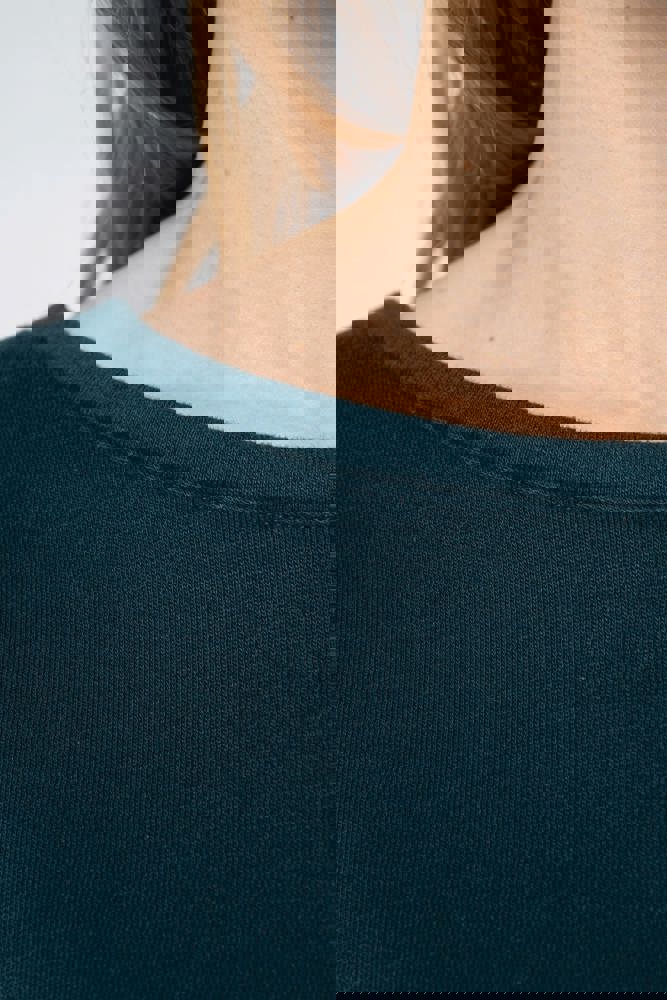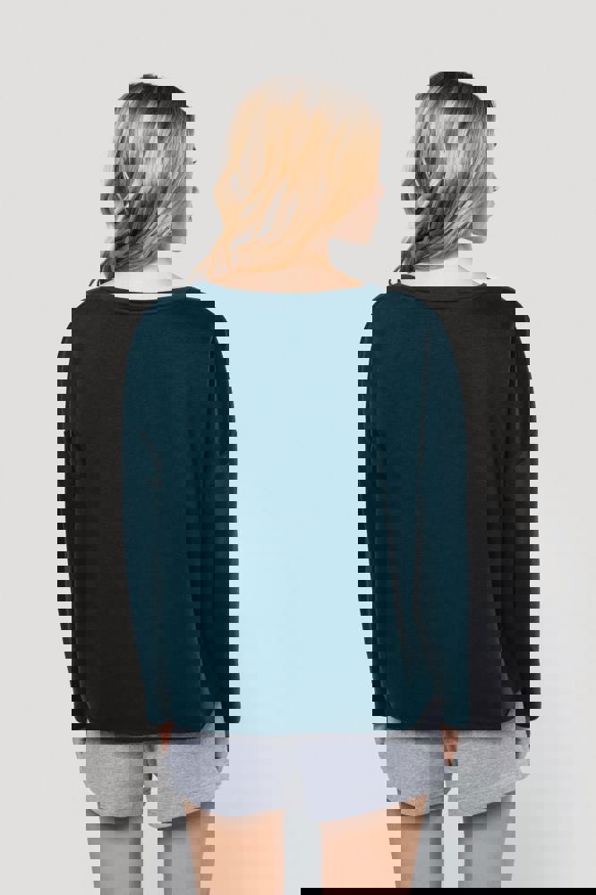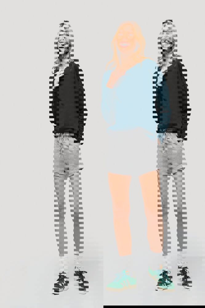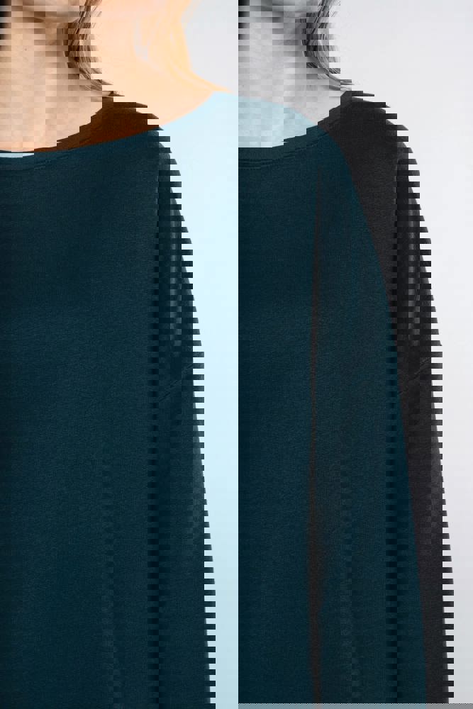 91 % Baumwolle / 9 % Polyester (Light Grey Heather: 87 % Baumwolle / 9 % Polyester / 4 % Viskose). Ungebürstetes Fleece „French Terry". Sehr weiche Textur. Lockere Passform mit großem Halsausschnitt. Fischgrätnackenband. Ungesäumter Abschluss unten. Doppelnähte am Ärmelbündchen.