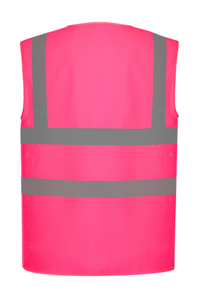 100% polyester. 100 % recycelter Polyester. Hergestellt aus PET-Kunststoffflaschen. Aus atmungsaktiver leichter Maschenware. 5 cm breite Reflexstreifen um den Körper und auf jeder Schulter. Klettverschluss an der Vorderseite. Entspricht American National Standard ANSI/ISEA 107-2004 & European Standard EN ISO20471: 2013 Klasse 2 : nur Hi Vis Orange und Hi Vis Yellow.
