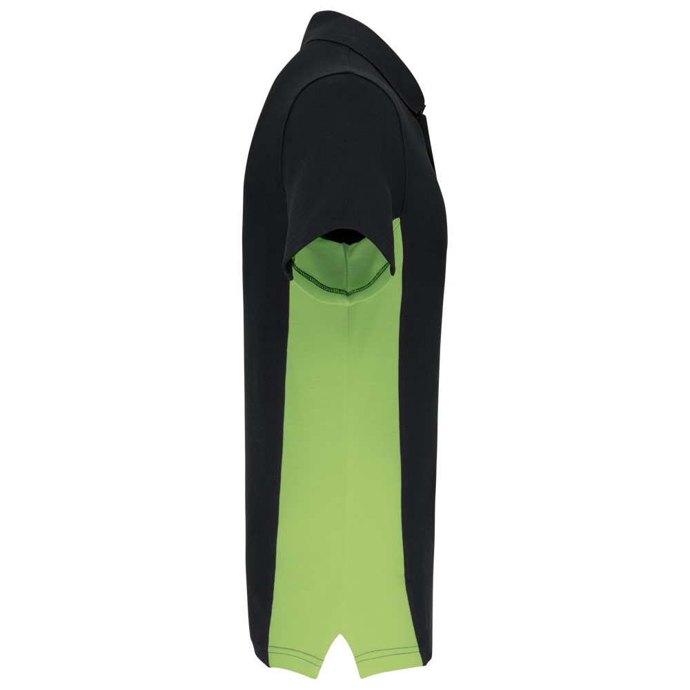 65% Polyester / 35% Baumwollpiqué. (Black/Dark Grey ; Forest Green/Black ; Royal Blue/Navy : 65% recyceltem Polyesterund 35 % Baumwolle). Rippstrickkragen. 3-Knopfleiste Ton in Ton. Kontrastfarbene Seiteneinsätze. Offener Armabschluss.
