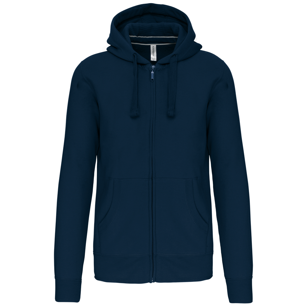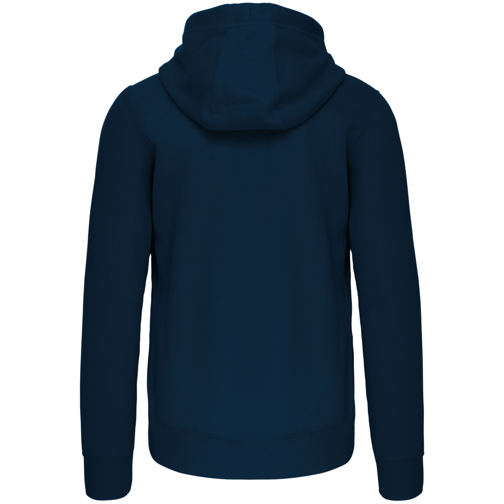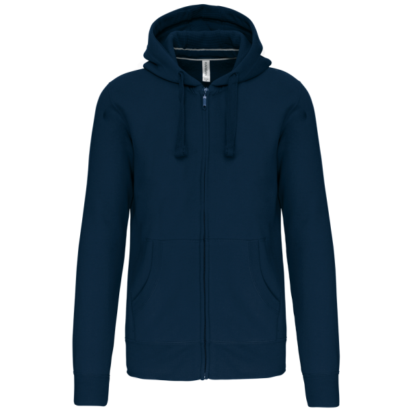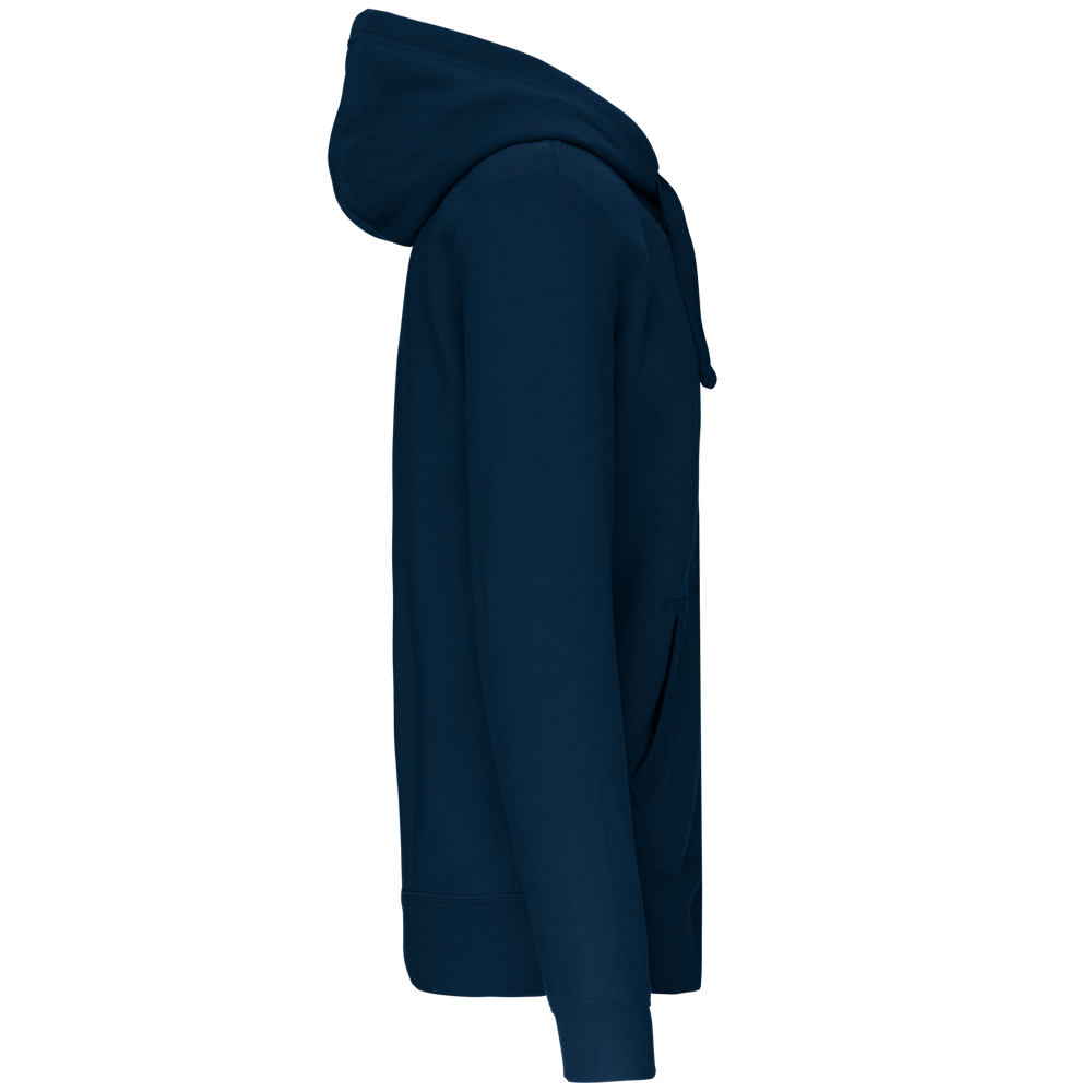 80% Baumwolle / 20% Polyester (Ash Heather : 79% Baumwolle / 20% Polyester / 1% Viskose). Außenseiteaus 100% gekämmte Baumwolle. Gebürstetes Fleece. Verstärktes Kontrast-Nackenband (Heather Grey für alle Farben, Navt für Oxford-Grey und Ash Heather). Kängurutasche. Gerippt an Bund und Saum. Gefütterte Kapuze in Kontrastfarbe innen und Kordelzug. Reißverschluss.