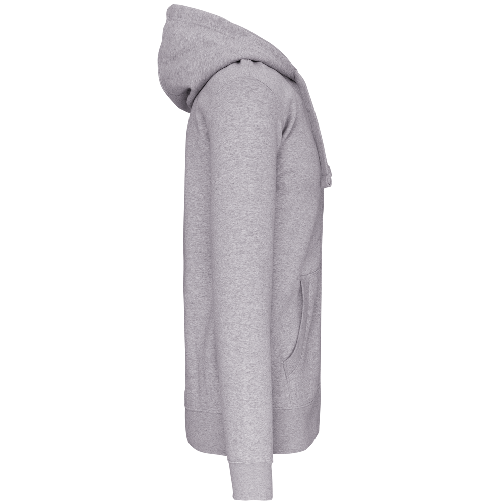 80% Baumwolle / 20% Polyester (Ash Heather : 79% Baumwolle / 20% Polyester / 1% Viskose). Außenseiteaus 100% gekämmte Baumwolle. Gebürstetes Fleece. Verstärktes Kontrast-Nackenband (Heather Grey für alle Farben, Navt für Oxford-Grey und Ash Heather). Kängurutasche. Gerippt an Bund und Saum. Gefütterte Kapuze in Kontrastfarbe innen und Kordelzug. Reißverschluss.