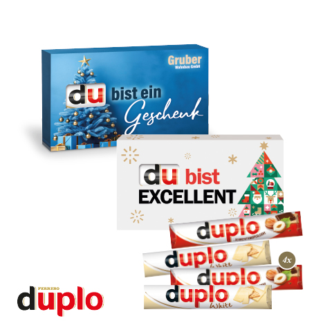 Die wahrscheinlich längste Praline der Welt! Der besonders knusperleichte Riegelgenuss, jetzt in einem 4er Advents-Set mit je einem duplo für jeden Adventssonntag. Sorgfältig ausgewählte Zutaten machen duplo unwiderstehlich lecker!. Produktdetails: duplo Riegel, in hochwertiger Vollkartonhülle, (FSC®-zertifiziert). 4-farbig bedruckt. Gleich mitbestellen: Stabiler Einzelkarton für den Postversand an Ihre Kunden: 0,59 Euro pro Stück. Nachhaltigkeit: Wir verwenden FSC®-zertifizierten Karton aus nachhaltiger Forstwirtschaft und anderen kontrollierten Quellen. Für jede Bestellung mit uns wird ein Baum über Grow my Tree gepflanzt.