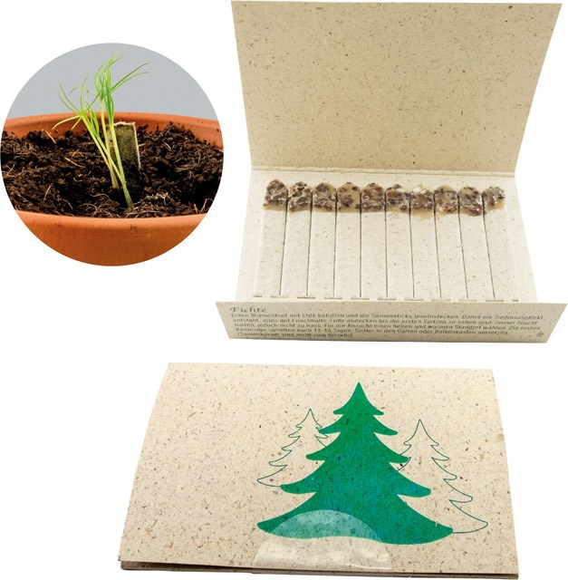 Ein naturiges und nachhaltiges Giveaway aus Graspapier mit Fichten-Samen für Ihren Weihnachtsbaum. Das Booklet bietet viel Platz für Ihren Werbeeindruck im Standardmotiv oder auch für Ihre eigene Gestaltung ab 250 Stück. Inhalt: 10 Samensticks Fichte