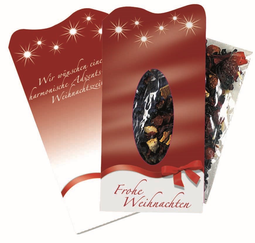 Dieser köstliche Weihnachts-Früchtetee ist an langen Winterabenden immer eine Bereicherung. Das Teepäckchen enthält ca. 10 g Weihnachts-Früchtetee für ca. 5 Tassen. Platz für den Werbedruck ist auf dem Standardmotiv der Banderole oder eine eigene Gestaltung, jeweils ab 500 Stück.