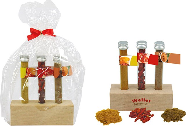 Ein perfektes Gewürz-Trio für die leichte indische und asiatische Küche. In einem Ständer aus Holz können die Reagenzgläser griffbereit in der Küche platziert werden. Hierbei kann das Logo nachhaltig im Tampondruck direkt auf dem Holzständer angebracht werden. Platz für den Werbedruck ist auf den Standardmotiven der Fähnchen oder eine eigene Gestaltung, jeweils bereits ab 100 Stück.