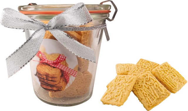 Das nachhaltige Weckglas, gefüllt mit hochwertigen Butter-Spekulatius, kann auch als Backform oder als Behältnis für Backzutaten verwendet werden. Ihr Werbeeindruck oder eine individuelle Gestaltung des Etiketts ist ab 100 Stück möglich.