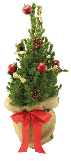 Inhalt: Bäumchen 35-45 cm geschmückt mit 5 roten Äpfelchen, 5 Tannenzapfen, 5 Bastschleifen, Topfdeko Jute, Schleife rot