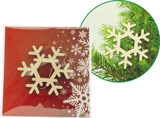 Die dekorative Holz-Schneeflocke gibt dem Schreibtisch einen weihnachtlichen Touch. Ein passender Aufhängehaken ist natürlich auch dabei. Die Einlegekarte im Standardmotiv bietet Platz für Ihre Werbeanbringung. Eine individuelle Gestaltung ist ebenfalls ab 250 Stück möglich. Inhalt: Holzornament Schneeflocke (ca. 50 mm), Aufhänger