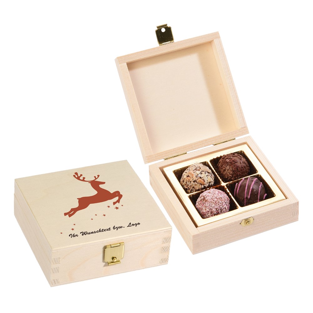 Vier edle Stückchen feinstes Genießerglück warten in der weihnachtsschmucken Holzkassette mit Metallverschluss darauf, von ihren Empfängern entdeckt und vernascht zu werden. Die schicke Box ist mit einer Auswahl unserer köstlichen Trüffelpralinen gefüllt. Unser weihnachtliches Standard-Motiv wird auf Wunsch mit einem Text oder Logo Ihrer Wahl komplettiert. Der Druck auf die Box ist dabei bereits im Preis enthalten. Ob für Einzelkämpfer oder Teams: Jeder findet seine Lieblingspraline und kann sie bequem und hygienisch naschen. Auch beim Außendienstbesuch in der Adventszeit, im Messebereich oder als weihnachtliches „Dankeschön“ im Hotelumfeld sicher ein passendes Präsent.