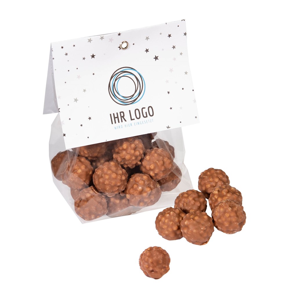 Die günstige Alternative zu Pralinen & Co. Begeistern Sie Ihre Kunden mit diesen knackig, schokoladigen Knusperkugeln . Die kleinen Kraftpakete aus Haferflocken , Reis-MaisPops und einer erlesenen Auswahl an Lebkuchengewürzen warten nur darauf vernascht zu werden. Die Faltkarte aus einem kräftigen 300g Karton bietet viel Platz für Weihnachtsgrüße und kann 4-farbig bedruckt werden. Die lange Haltbarkeit sorgt außerdem für Planungssichheit und eine entspannte Verteilung an Außendienstler, Mitarbeiter oder Kunden.