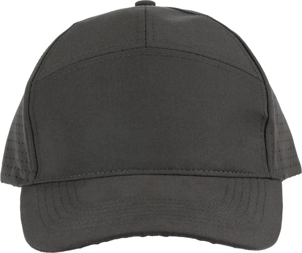 Mütze aus Polyester mit gelaserten Luftlöchern auf der Rückseite. Ausgestattet mit einem 7-Panel-Design mit Frontpanel und 7 cm Schild. Verstellbar, atmungsaktiv, ohne PU-Etikett.