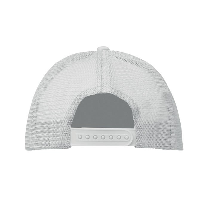 Trucker Kappe. 5 Panele. 140-150 gr/m2 Polyester. Verstellbarer Kunststoffverschluss. Weißes Frontpanel, farbiger Kappenschirm aus Polyester Jersey mit Schaum-Verstärkung. Weitere Panele aus Mesh. Größe 7 1/4.