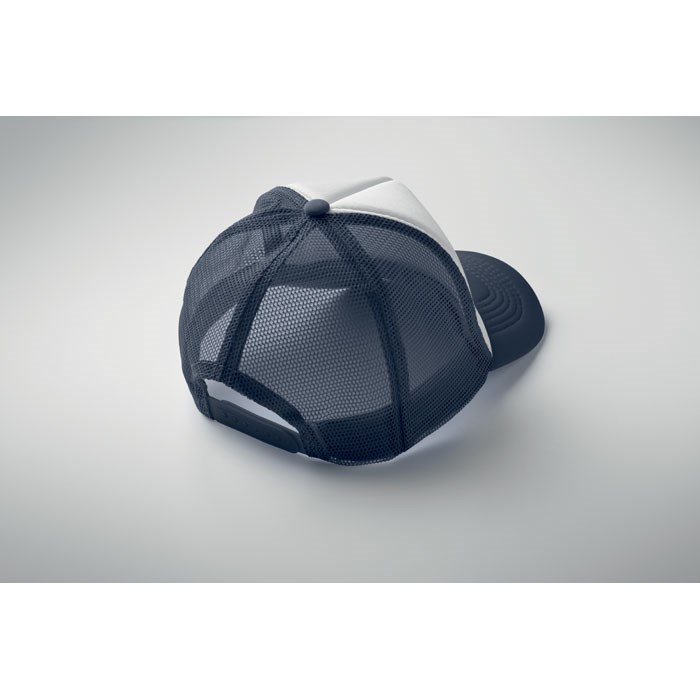 Trucker Kappe. 5 Panele. 140-150 gr/m2 Polyester. Verstellbarer Kunststoffverschluss. Weißes Frontpanel, farbiger Kappenschirm aus Polyester Jersey mit Schaum-Verstärkung. Weitere Panele aus Mesh. Größe 7 1/4.