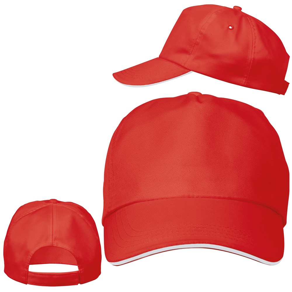 Baseballcap aus Polyester mit Sandwich und Klettverschluss. Ihre Werbung drucken wir mittig auf die Stirn.