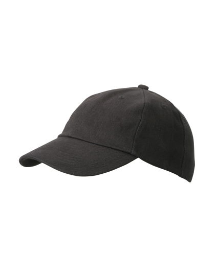 Stark gebürstete Baumwolle | Metallschnalle in Mattsilber mit Druckknopf und Stoff-Öse | Sechs gestickte Luftlöcher | Acht Ziernähte auf dem Schirm | Stirnanliegend | Gefüttertes Satin-Schweißband | Farbe Schwarz auch für 60-cm-Kopfgröße erhältlich