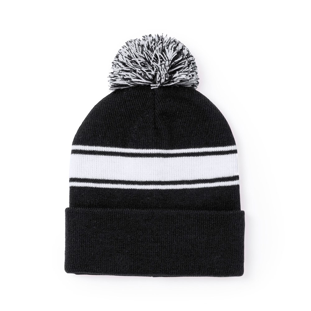Weiche und warme Mütze aus Acryl in einer Vielzahl von Farben. Mit originellem Design, weißem Streifen und farblich passendem, zweifarbigem Bommel.