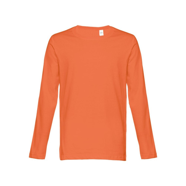 Herren Langarmshirt aus 100% Strickjersey und Baumwolle (150g/m²) mit kardiertem Baumwollfaden, in Tubular-Form, geripptem Kragen in 1x1 Ripp, Jersey-Verstärkung und Doppelnaht an Ärmeln und Saum. Bei den Farben 195, 195 bestehend aus 60% Baumwolle und 40% Polyester, Farbe 183 bestehend aus 90% Baumwolle und 10% Viskose. Größen: S, M, L, XL, XXL