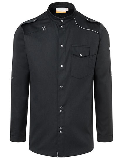 Köpergewebe, 150 g/m² | Hochveredelt, gekrumpft, waschecht, pflegeleicht | Kochhemd aus besonders leichtem Stoff | Hellgraue Kontrastnähte, modischer Stehkragen und Zierriegel an den Schultern | Druckknöpfe | Brusttasche | Zwei Stiftfächer neben der Brusttasche | Hochkrempeln und einfaches Fixieren der Ärmel durch zusätzliche Befestigungsriegel | Industriewäschetauglich | Bis 95°C waschbar | Navy: Nicht bleichen