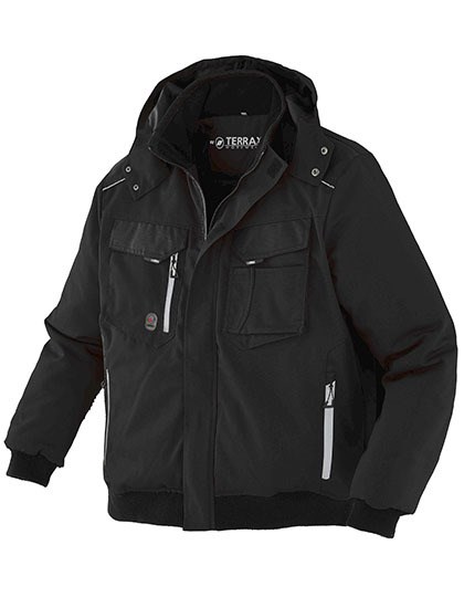 Strapazierfähige Workwear Piloten Jacke aus robusten Canvas Material | Wärmendes wattiertes Stepp-Innenfutter | Im Kragen integrierte Kapuze | Stehkragen mit angenehm weichem Fleece innen | Abgedichteter Reißverschluss mit zusätzlicher Klett-gesicherter Sturmblende außen | Aufgesetzte Brusttasche links mit Cargofalte, mit Patte sowie Klett gesichert und mit zwei zusätzlichen Fächern | Aufgesetzte Brusttasche rechts mit Cargofalte. Patte mit Klett gesichert, und zusätzlich zu Öffnen durch Reißverschluss | Innenliegende Brusttasche links mit Reißverschluss gesichert sowie zwei Mesh-Innentaschen rechts und links | Abgedichtete seitliche Reißverschlusstaschen außen mit Zippergarage | Terrax Workwear Label | Kontrastfarbene und reflektierende Details | Elastischer Bund- und Armabschluss in Co-Ea.-Yarn Rippware