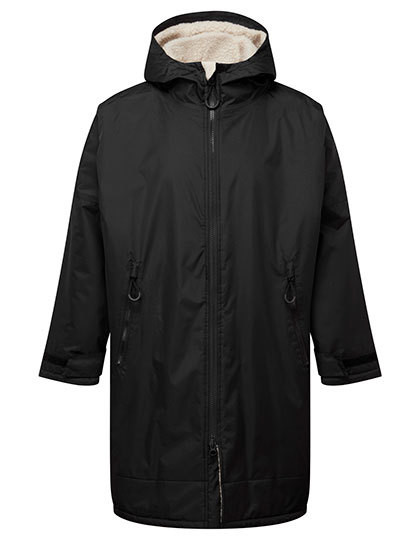 Unisex | Oversized | Durchgehender Zwei-Wege-Reißverschluss aus Kunststoff mit leicht zu bedienenden Schiebern | Kinnschutz | Oversized-Passform | Seitliche Belüftungsöffnungen | Verstellbare Ärmelbündchen mit Klettverschluss | Seitliche Reißverschlusstaschen | Innentasche mit Reißverschluss auf der linken Seite | Aufgesetzte Innentasche auf der rechten Seite | 3-teilige Kapuze | Schlaufe in der Mitte der Rückseite der Jacke zum Aufhängen des Bademantels | Verlängerter Saum hinten | Zugang zum Stickbereich auf der Rückseite, Brustbereich auch hier zugänglich | Wasserdichte, versiegelte Nähte | Innenseite aus Sherpa-Fleece | Transporttasche mit doppeltem Kordelzug
