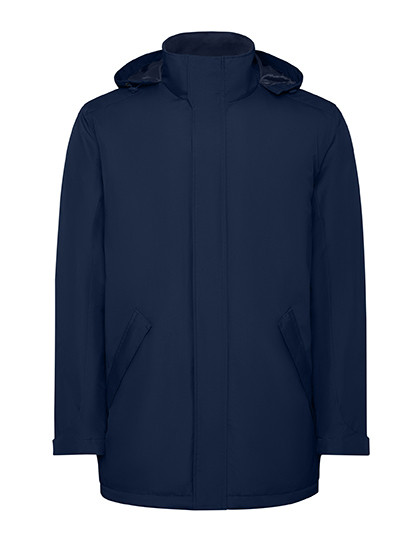 Recycelter Polyester | Wasserdichter und gefütterter Parka | Hoher Kragen mit faltbarer Kapuze und Klettverschluss | Dazu passender zentraler Reißverschluss mit Patte | Seitentaschen mit Reißverschluss und fester Patte | Innentasche mit Klettverschluss | Verstellbare Manschetten mit Klettverschluss | Veredelungszugang auf dem Rücken und der linken Brust