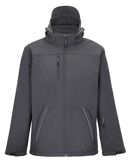 8000 mm Wassersäule | Atmungsaktive Membran | Futtertaft: 100% Polyester | Füllung: 100% Polyester 160gsm | Vollständig wattierte Softshelljacke für Herren | Abnehmbare Kapuze mit Kapuzenschirm, einstellbar mit zwei Zugkordeln mit Stoppern und Klettverschluss | Drei Fronsttaschen mit Reißverschluss | Eine Reißverschluss-Ärmeltasche | Eine Reißverschluss-Innentasche | Eine Mesh-Innentasche | Verstellbare Ärmelbündchen mit Klett-Patte und inneren Stretch-Bündchen | Elastischer Kordelzug am Bund