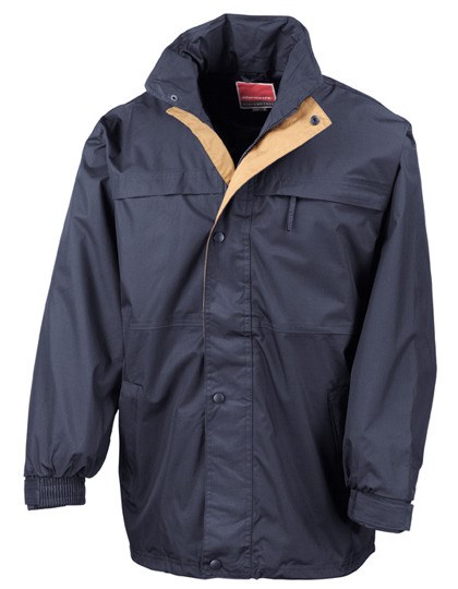 Außen: 200 g/m² StormDri 4000, 100% Polyester mit PVC-Beschichtung | Futter: 100% Polyester | Wasserdicht (4000 mm) und winddicht | Versiegelte Säume und Doppelnadel-Steppnähte | Eingeschlagene Kapuze im Kragen | Durchgehender Front-Reißverschluss | Zwei Seitentaschen, eine Brusttasche und eine Handy-Innentasche | Elastische Bündchen mit verstellbarem Klettverschluss | Saum mit verstellbarem Kordelzug und mit Druckknopf verschließbare Windbremse | Farblich abgesetztes Netzfutter | Veredelungszugang: verdeckt innen auf der Rückseite mit Reißverschluss