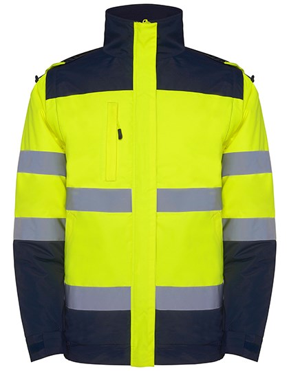 Außen: 100% Polyester - Wasserdicht, Innen: 100% Polyester, Wattierung: 100% Polyester, 400 g/m² | Reflexbänder an Körper und Ärmeln | Kapuze optional mit fluoreszierendem Saum, mit Stoppern verstellbar | Brusttasche mit Reiẞverschluss | Zwei leicht schräg laufende Fronttaschen | Elastischer Bund | Elastische Armmanschetten mit verstellbarem Klettverschluss | Reflektierender durchgehender Reiẞverschluss mit Puller in Fluor, Patte und Klettverschluss | Innere Brusttasche mit Reiẞverschluss als Veredelungszugang | Abnehmbare Ärmel | Wind- und Regenabweisend | Zertifiziert nach CE-Normen: EN ISO 13688:2013 und EN ISO 20471:2013/A1:2016, Klasse II | Der Hersteller gewährleistet die Reflektionseigenschaft gemäß EN-Norm für 25 Waschgänge bis 30 °C | Dies ist ein Artikel zur Persönlichen Schutzausrüstung (PSA). Gemäß EU-Verordnung 2016/425 über persönliche Schutzausrüstung ist eine EU-Konformitätserklärung seitens des Herstellers Pflicht. Diese stellen wir Ihnen auf Anfrage gerne zur Verfügung.