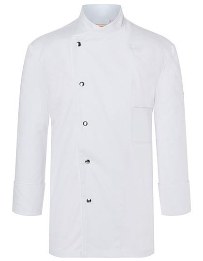 Köpergewebe, 215 g/m² | Hochveredelt, gekrumpft, waschecht, pflegeleicht | Kochjacke für Herren in normaler Passform | Wiener Nähte am Rückenteil | Ärmelmanschetten mit Schlitz | Aufgesetzte, angeschrägte Brusttasche mit Kugelschreiberfach links | Einreihige 5-Knopf Jacke mit Druckknöpfen | Industriewäschetauglich | Bis 95°C waschbar