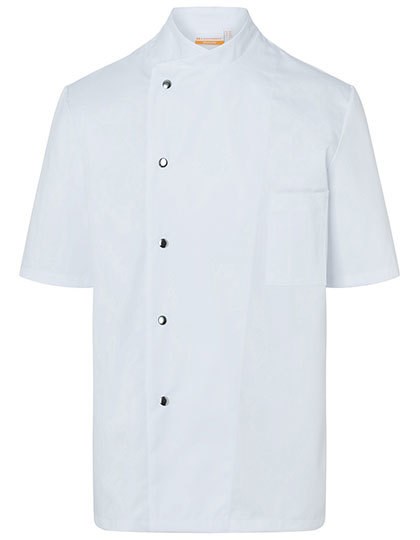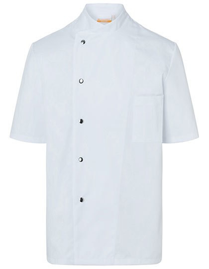 Köpergewebe, 215 g/m² | Hochveredelt, gekrumpft, waschecht, pflegeleicht | Kochjacke für Herren in normaler Passform | Wiener Nähte am Rückenteil | Aufgesetzte, angeschrägte Brusttasche mit Kugelschreiberfach links | Kurzen Ärmel | Einreihige 5-Knopf-Jacke mit Druckknöpfen | Industriewäschetauglich | Bis 95°C waschbar