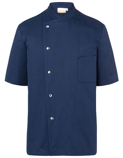 Köpergewebe, 215 g/m² | Hochveredelt, gekrumpft, waschecht, pflegeleicht | Kochjacke für Herren in normaler Passform | Wiener Nähte am Rückenteil | Aufgesetzte, angeschrägte Brusttasche mit Kugelschreiberfach links | Kurzen Ärmel | Einreihige 5-Knopf-Jacke mit Druckknöpfen | Industriewäschetauglich | Bis 95°C waschbar