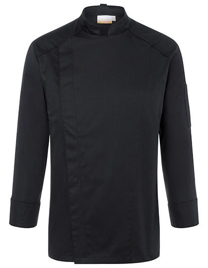 Köpergewebe, 150 g/m² | Hochveredelt, gekrumpft, waschecht, pflegeleicht | Kochjacke mit verdeckter Knopfleiste aus sehr leichtem Stoff | Schlanke Silhouette | Druckknöpfe zum schnellen Öffnen und Schließen | Praktische Schlaufe am hinteren Kragen zum Halten einer Latzschürze (verhindert das Verrutschen) | Ärmelmanschetten mit Schlitz | Aufgesetzte Ärmeltasche links mit Stiftfach | Industriewäschetauglich | Bis 95°C waschbar