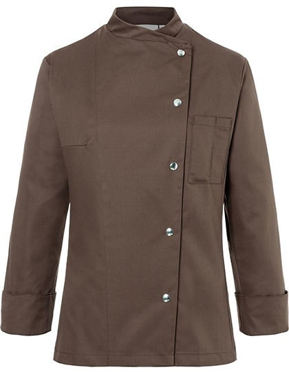 Köpergewebe, 215 g/m² | Hochveredelt, gekrumpft, waschecht, pflegeleicht | Kochjacke für Damen in körpernaher Passform | Brustabnäher, Flankennähte vorn und hinten | Ärmelmanschetten mit Schlitz | Aufgesetzte, angeschrägte Brusttasche links, mit Stiftfach | Einreihige 5-Knopf Jacke mit Druckknöpfen | Industriewäschetauglich | Bis 95°C waschbar