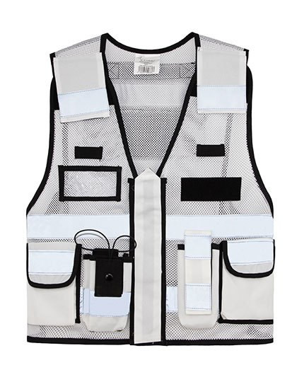 Mesh Tactical Weste mit markanten Reflexstreifen | Ideal für heiße Einsatzgebiete | Durchgehender Reißverschluss vorne, verstärkt durch eine Klappe | Flexibler Einsatz durch diverse Taschen | Verschiedene austauschbare Patches, die ebenfalls als Druckfläche dienen | Tear-Off-Label | Praktische Doppelgrößen mit Klettverschlüssen zur individuellen Anpassung