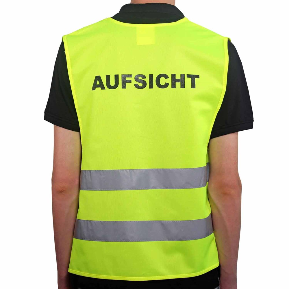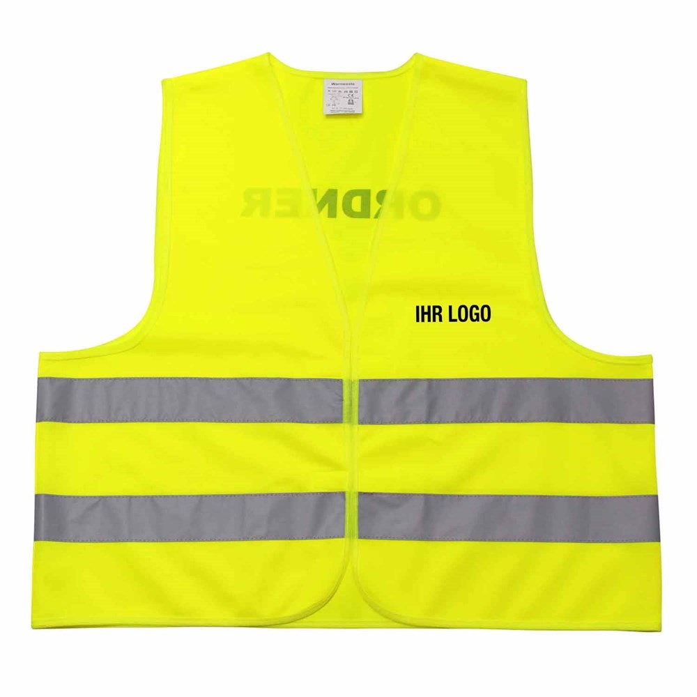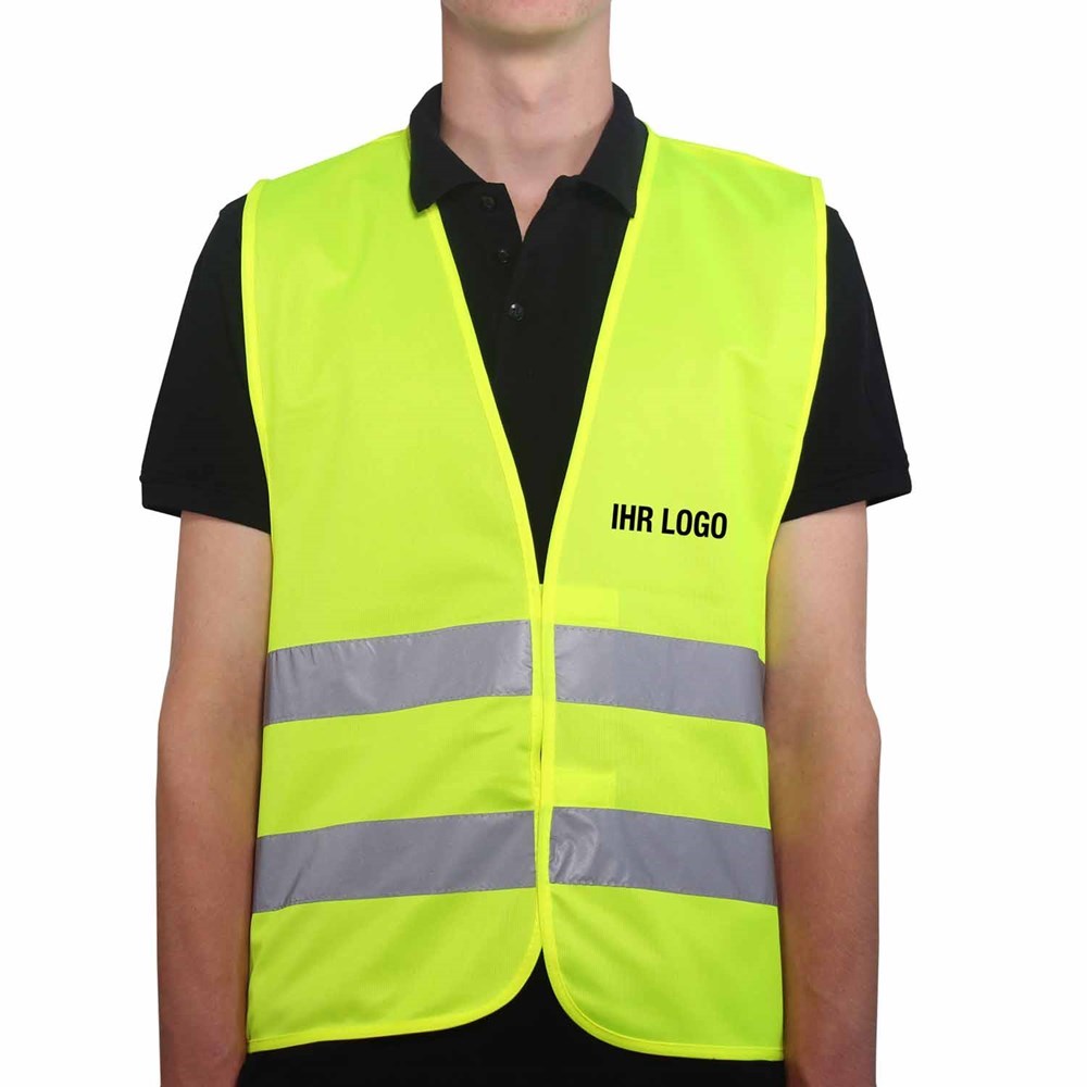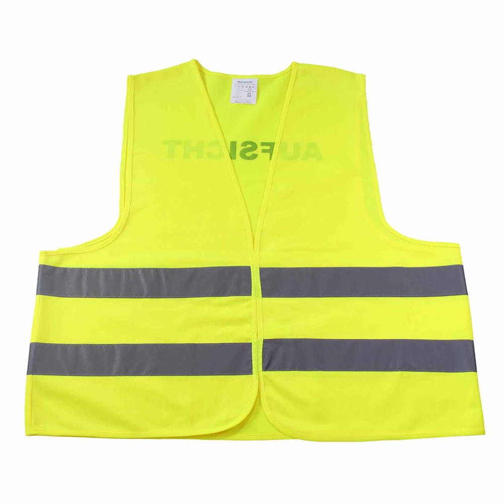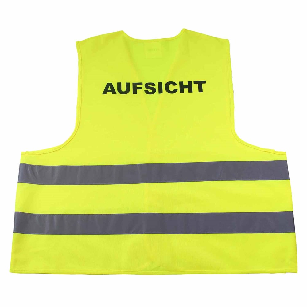 Unsere Warnweste Premium gelb ist aus 100% Polyester, wird nach EN ISO 20471 produziert und ist TÜV-Rheinland geprüft. Mit Anleitung einzeln im wiederverschließbaren Polybeutel verpackt. Durch die beiden Klettverschlüsse ist die Größe variabel einstellbar. Mit zwei reflektierenden Streifen, perfekt vernähte Qualität und Einleger in sieben Sprachen mit den gesetzlichen Pflichtangaben. Mit dem Standardmotiv 'Aufsicht' auf der Rückseite 1farbig schwarz bedruckt. Ein zusätzlicher Druck auf der Vorderseite ist möglich. Gern erstellen wir Ihnen dazu ein Angebot.