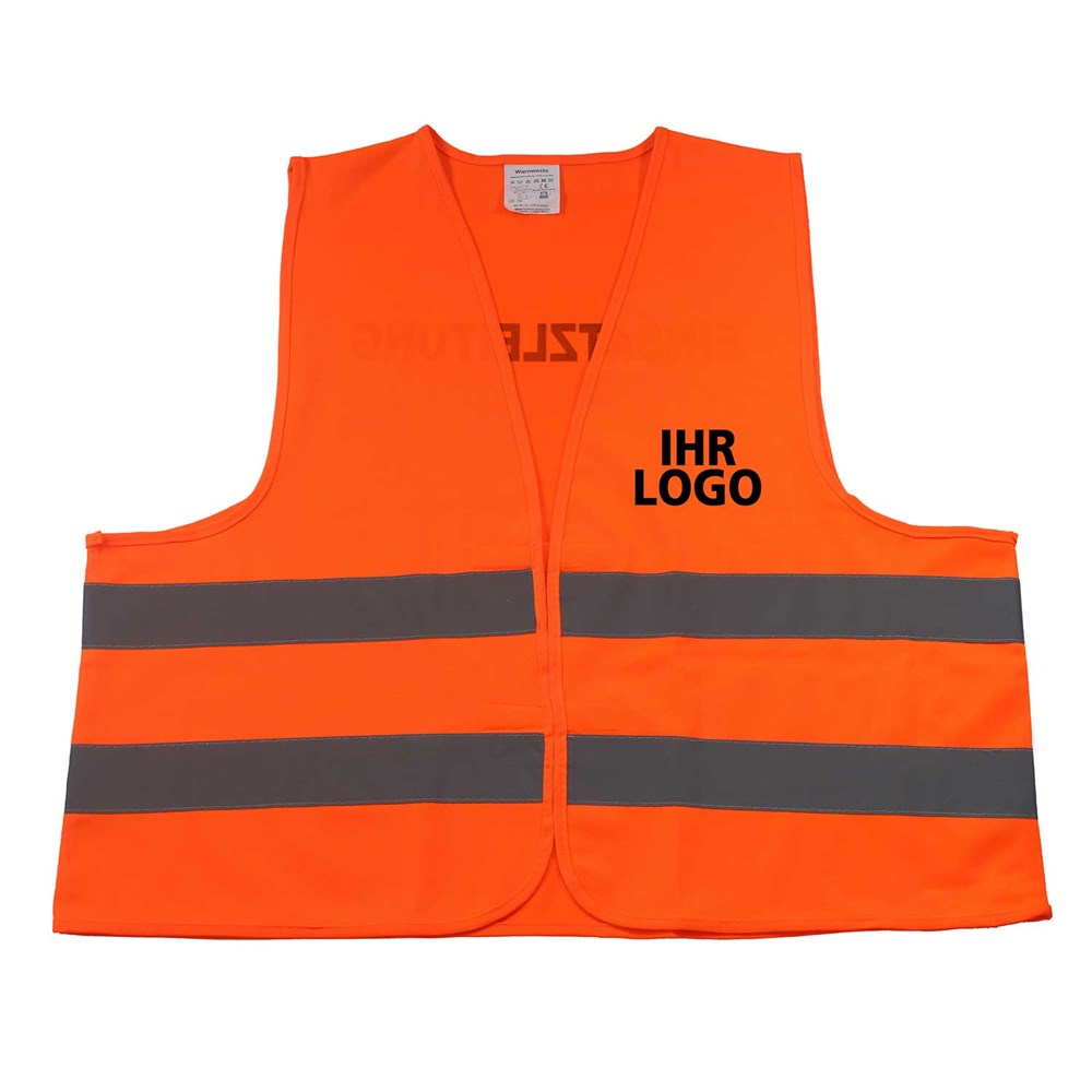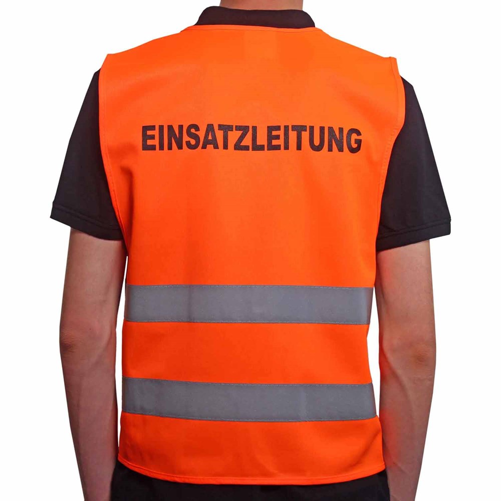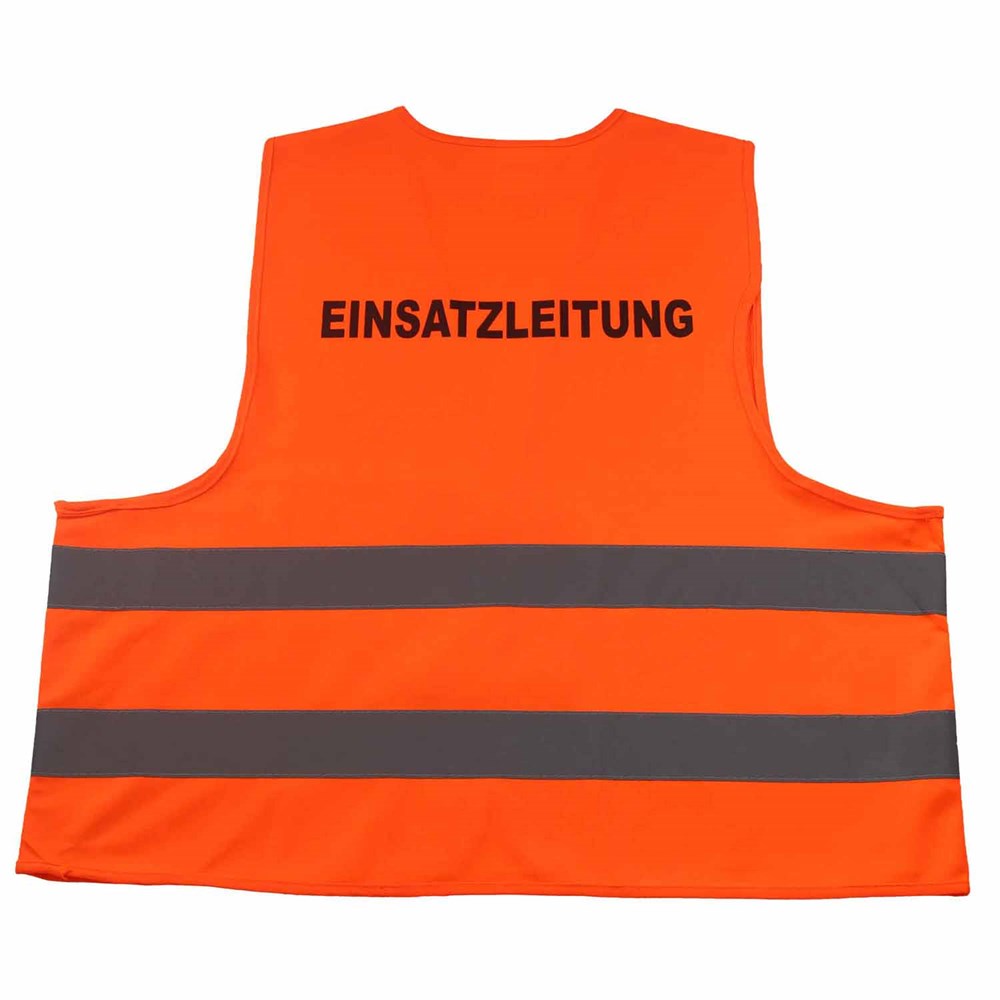 Unsere Warnweste Premium orange ist aus 100% Polyester, wird nach EN ISO 20471 produziert und ist TÜV-Rheinland geprüft. Mit Anleitung einzeln im wiederverschließbaren Polybeutel verpackt. Durch die beiden Klettverschlüsse ist die Größe variabel einstellbar. Mit zwei reflektierenden Streifen, perfekt vernähte Qualität und Einleger in sieben Sprachen mit den gesetzlichen Pflichtangaben. Mit dem Standardmotiv 'Einsatzleitung' auf der Rückseite 1farbig schwarz bedruckt. Ein zusätzlicher Druck auf der Vorderseite ist möglich. Gern erstellen wir Ihnen dazu ein Angebot.