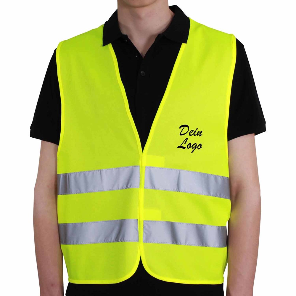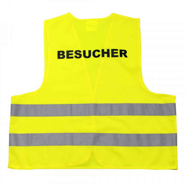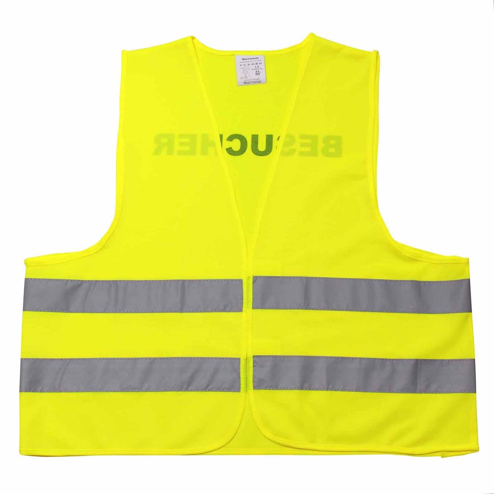 Unsere Warnweste Premium gelb ist aus 100% Polyester, wird nach EN ISO 20471 produziert und ist TÜV-Rheinland geprüft. Mit Anleitung einzeln im wiederverschließbaren Polybeutel verpackt. Durch die beiden Klettverschlüsse ist die Größe variabel einstellbar. Mit zwei reflektierenden Streifen, perfekt vernähte Qualität und Einleger in sieben Sprachen mit den gesetzlichen Pflichtangaben. Mit dem Standardmotiv 'Besucher' auf der Rückseite 1farbig schwarz bedruckt. Ein zusätzlicher Druck auf der Vorderseite ist möglich. Gern erstellen wir Ihnen dazu ein Angebot.
