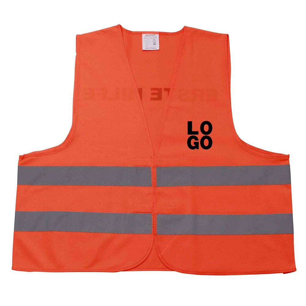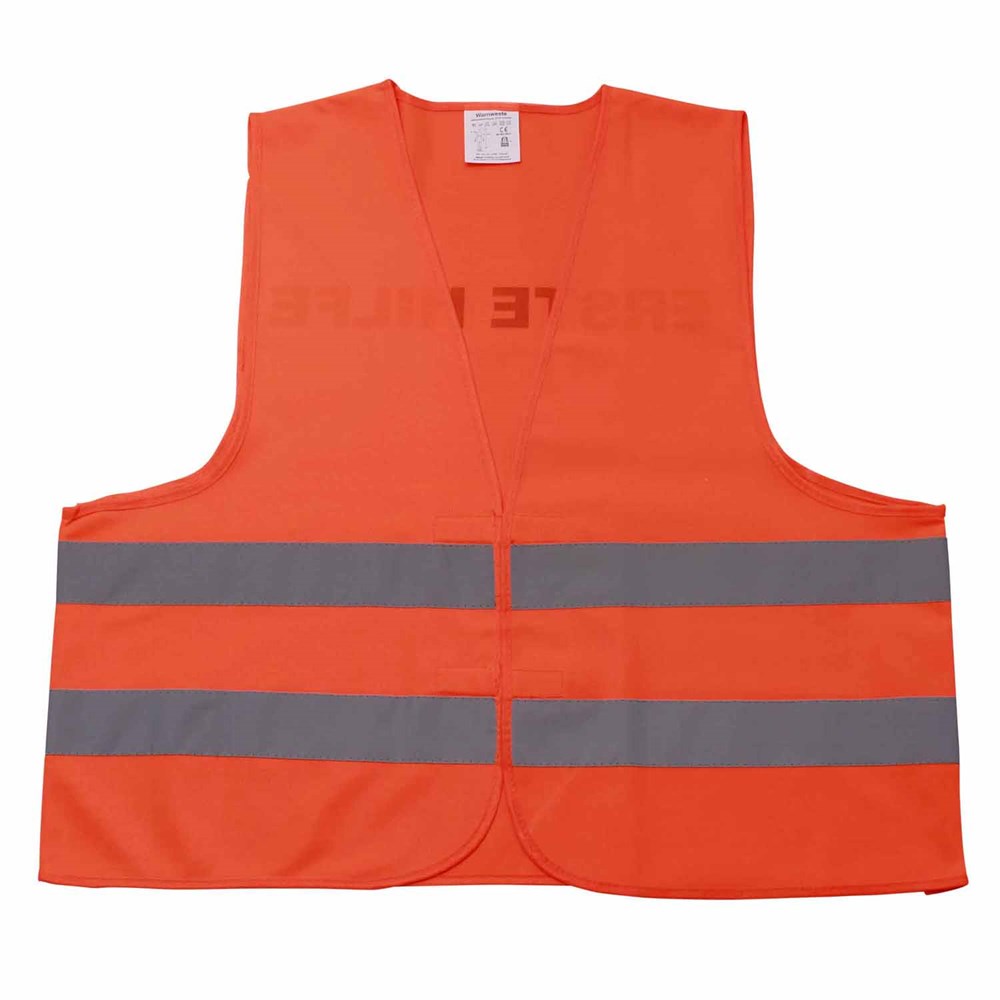 Unsere Warnweste Premium orange ist aus 100% Polyester, wird nach EN ISO 20471 produziert und ist TÜV-Rheinland geprüft. Mit Anleitung einzeln im wiederverschließbaren Polybeutel verpackt. Durch die beiden Klettverschlüsse ist die Größe variabel einstellbar. Mit zwei reflektierenden Streifen, perfekt vernähte Qualität und Einleger in sieben Sprachen mit den gesetzlichen Pflichtangaben. Mit dem Standardmotiv 'Erste Hilfe' auf der Rückseite 1farbig schwarz bedruckt. Ein zusätzlicher Druck auf der Vorderseite ist möglich. Gern erstellen wir Ihnen dazu ein Angebot.